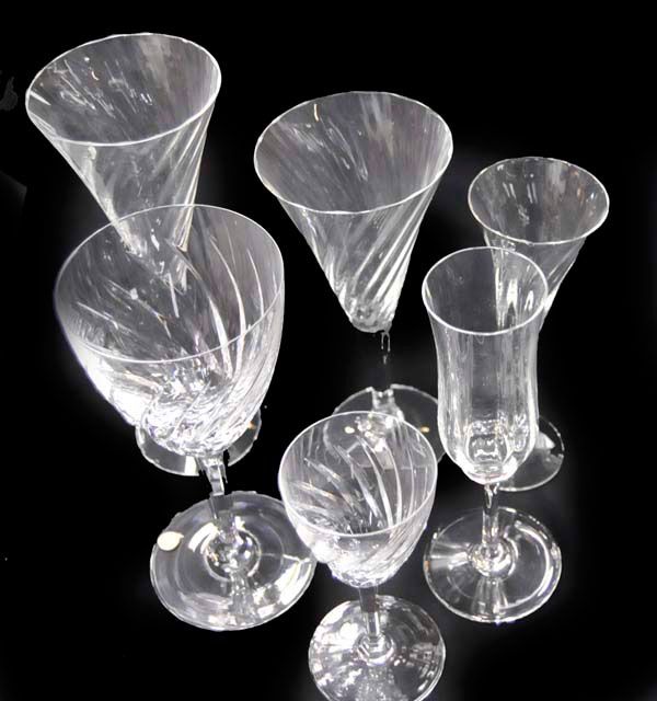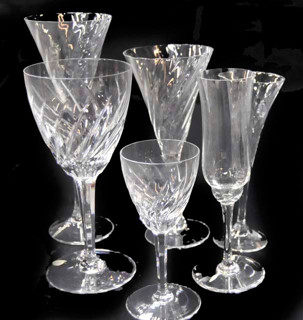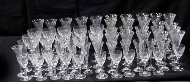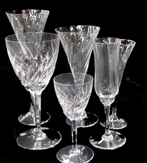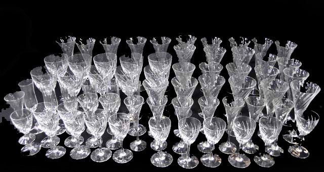 Including: Orrefors, Val St. Lambert & Baccarat. 13 wine glasses, 10 small champagne glasses, 12 medium size champagne glasses, 13 regular size champagne glasses, 10 white wine goblets & 6 Baccarat small champagne glasses. From a Sutton