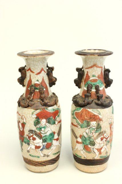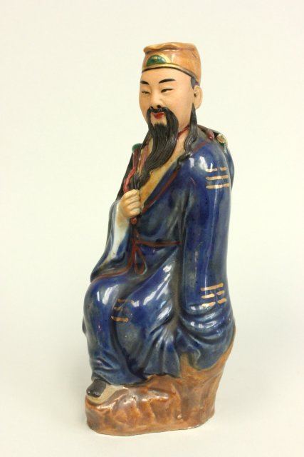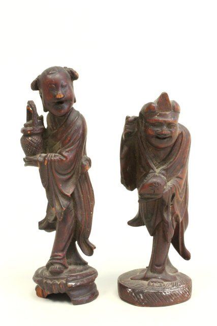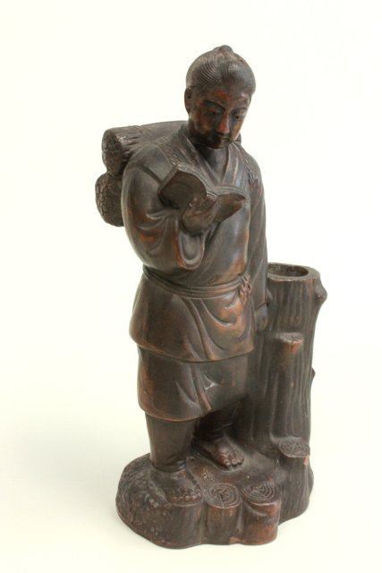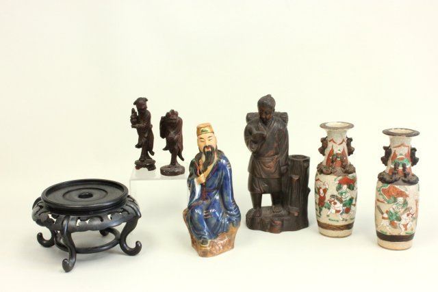 Including: Pair vases, stamped, depicting "Battle Scene", approx. 7.5" H. 2 wood figures, approx. 4.75" H. 1- Pottery figure of a "God", stamped China, approx. 8.25" H. Teakwood pedestal. Terracotta figure of "Boy Reading a Book", approx. 9.5" H. 1 vase as is, 1 wood figure as is, terracotta figure has small chip on log.