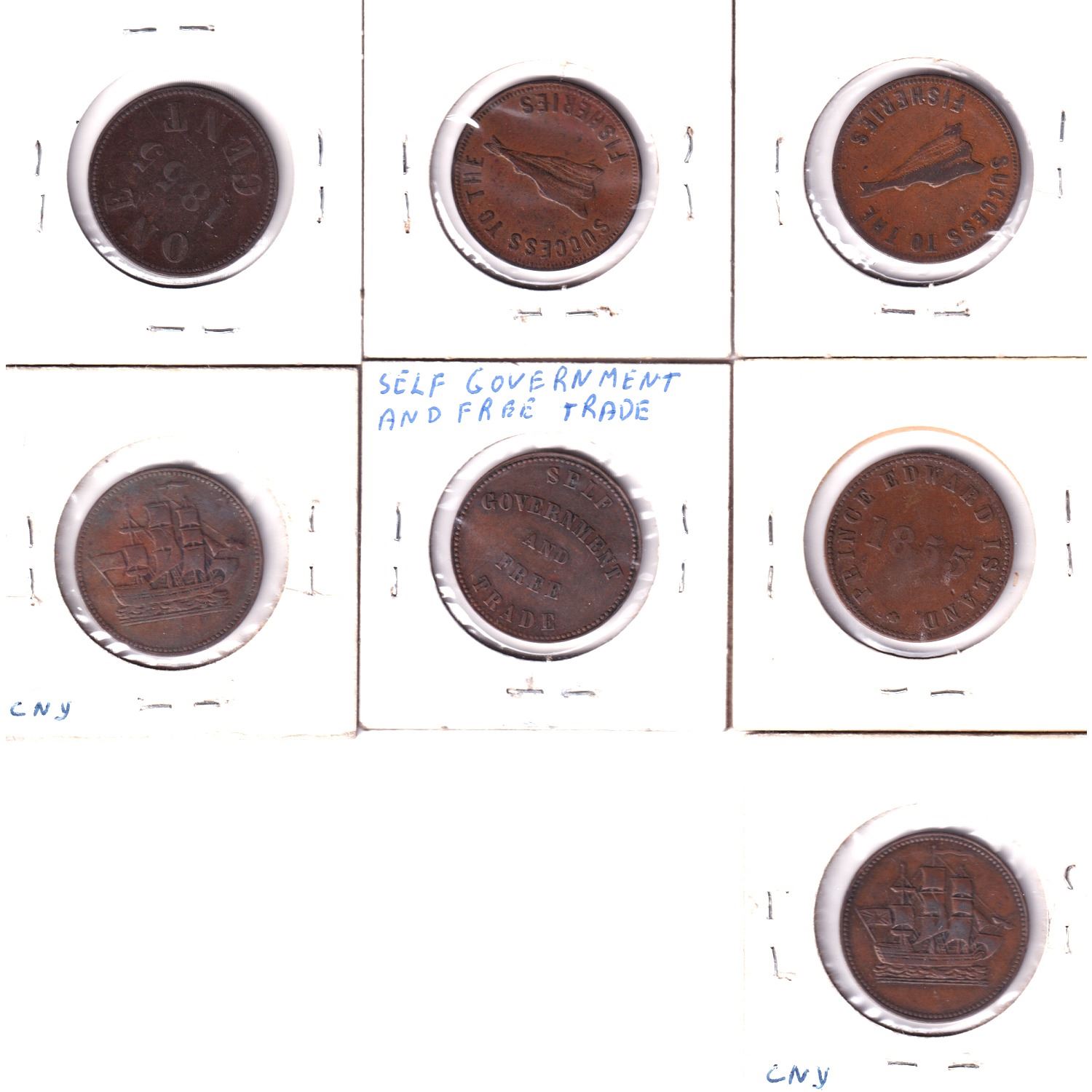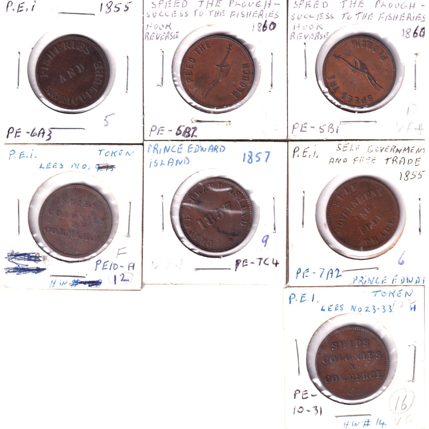 Group lot of 7x Canadian tokens. Items include: PE-5B1, PE-5B2, PE-6A3, PE-7A2, PE-7C4, PE-10A & PE-