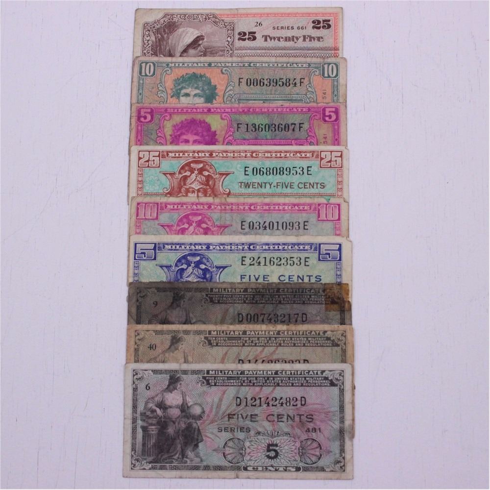 Group lot of 9 different Military Payment Certificates from the United States.