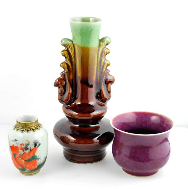 1- Chinese Jun-Yao porcelain Zha Duo vase, approx. 2.5" H x 3" W. 1- Chinese Famille Rose porcelain "8 Immortals" pot, approx. 2.75" H. 1- Chinese porcelain vase, approx. 7.25" H. Please read our terms of sale.