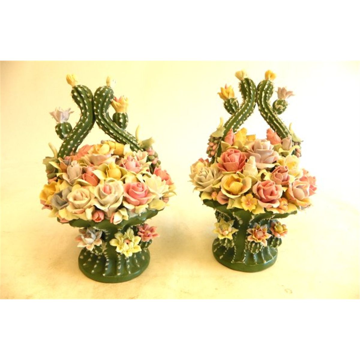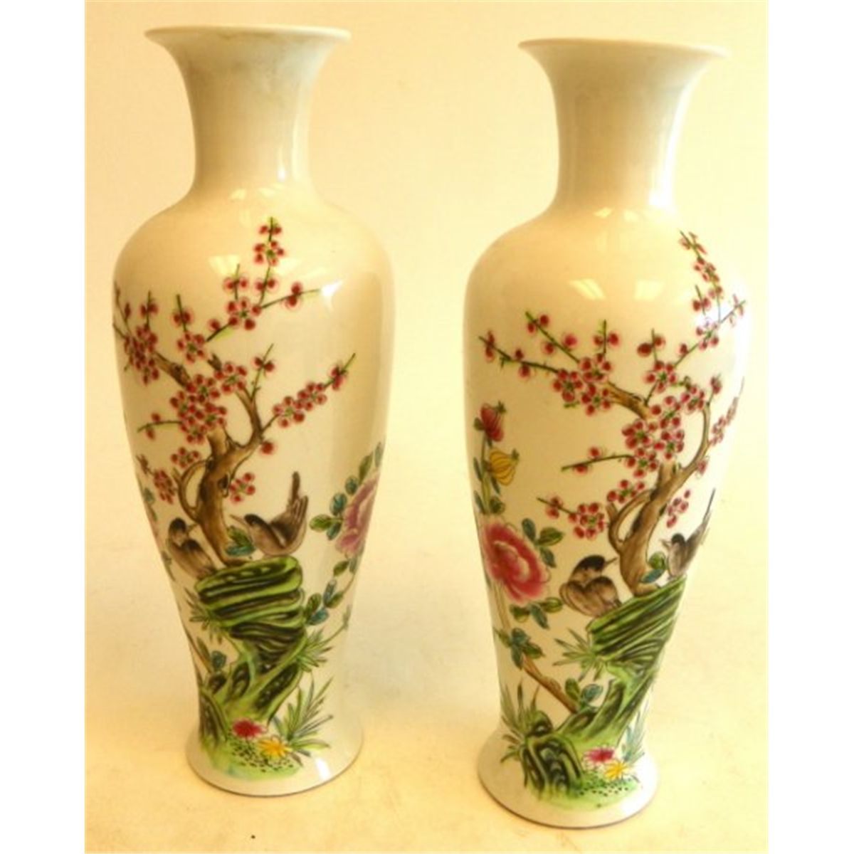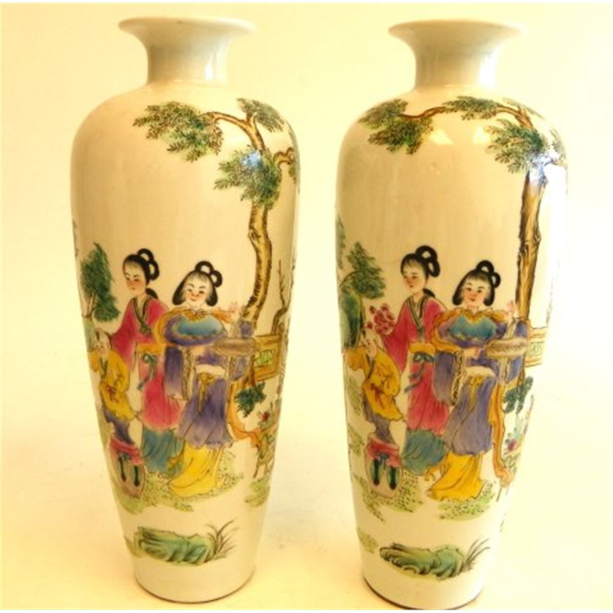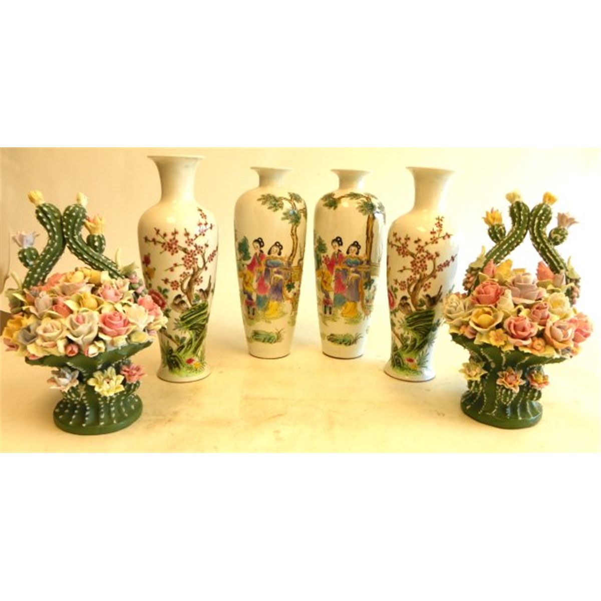 1- Pair Famille Rose porcelain flower baskets, approx. 12" x 9". 1- Pair Famille Rose porcelain vases with "Figure" decoration, approx. 13" H. 1- Pair Famille Rose vases with "Figure" decoration, approx. 13" H.