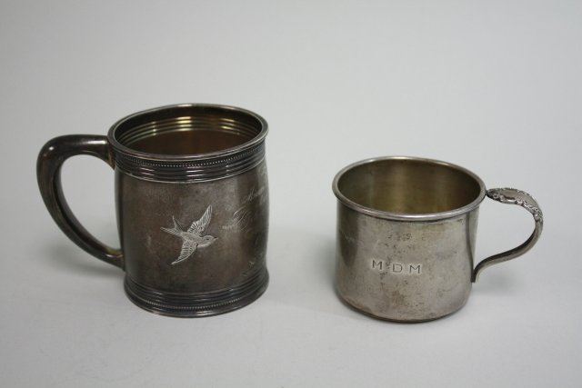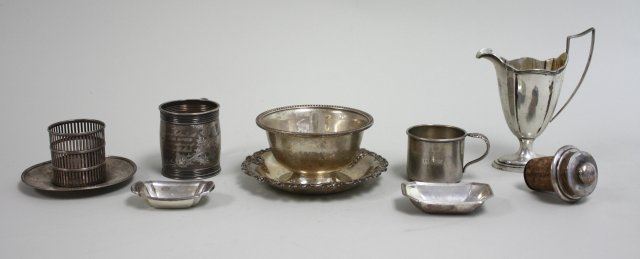 Including, Gorham gravy boat - approx. 6ozt, 2 Gorham nut dishes - approx. 1.32ozt, Cigarette holder marked 1961 - approx. 2.85ozt, Wallace bowl with under plate - approx. 6.79ozt., etched cup - aprox. 4.25ozt, Rogers baby mug - apox. 1.83ozt & cork stopper for decanter. Total weight approx. 26.5ozt. 8 pieces total.