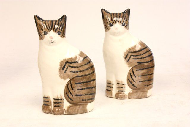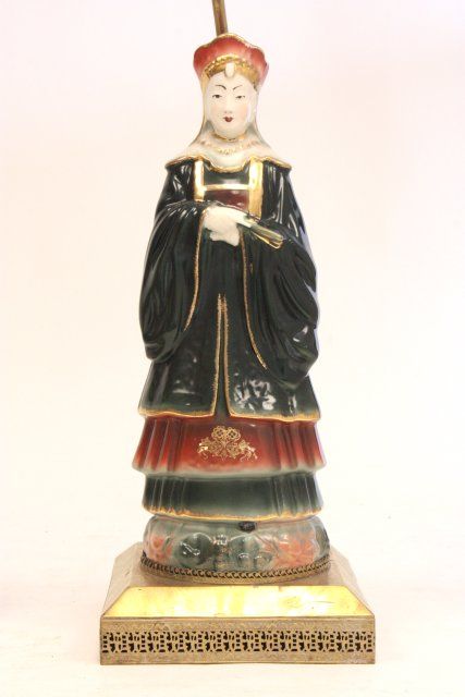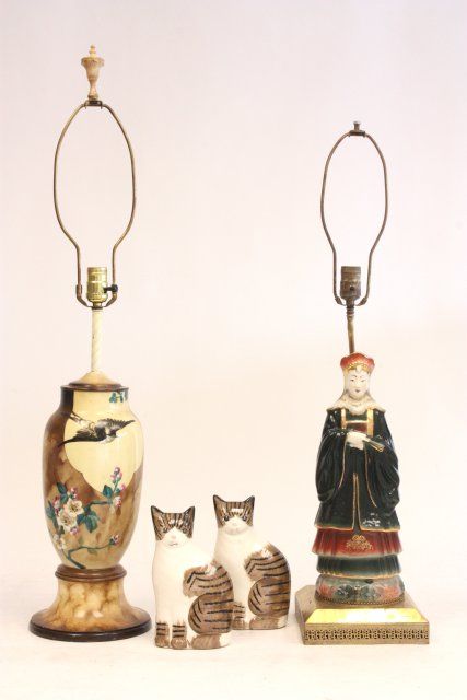 2- Table lamps. 1- Handpainted vase. 1- Chinese porcelain figure of a "Woman". 1- Pair "Cat" figures, glazed finish, approx. 8" H. Both lamps approx. 18" H. Please read our terms of sale.