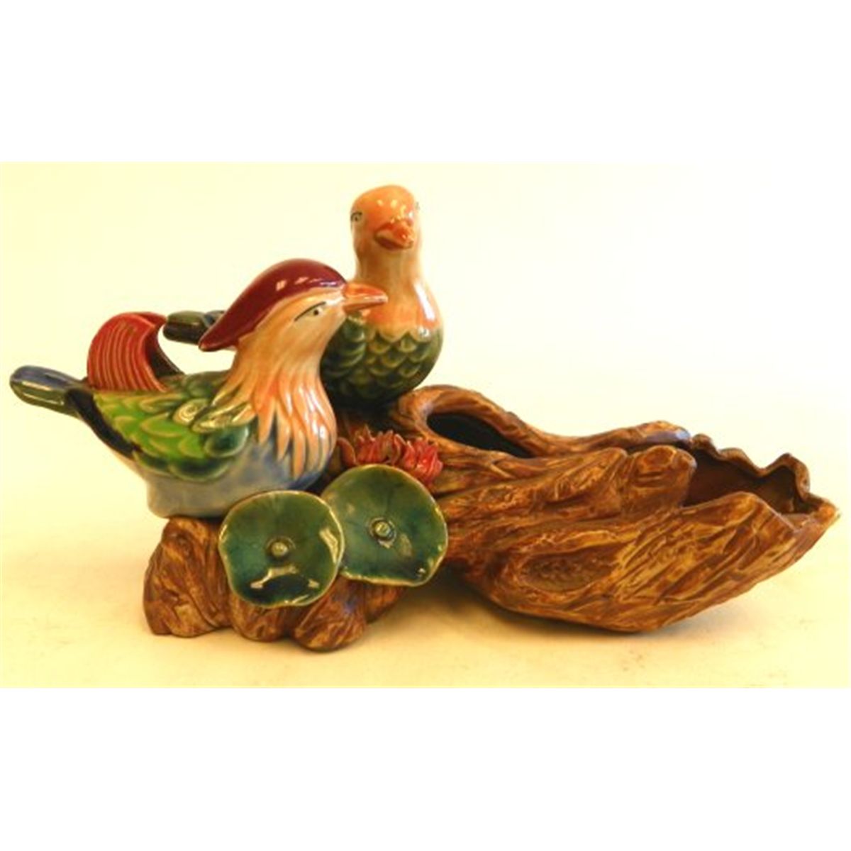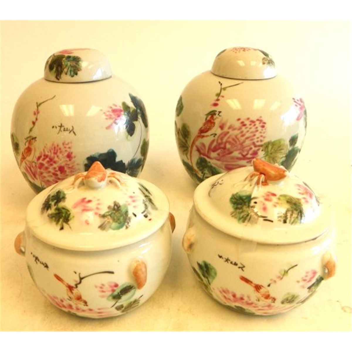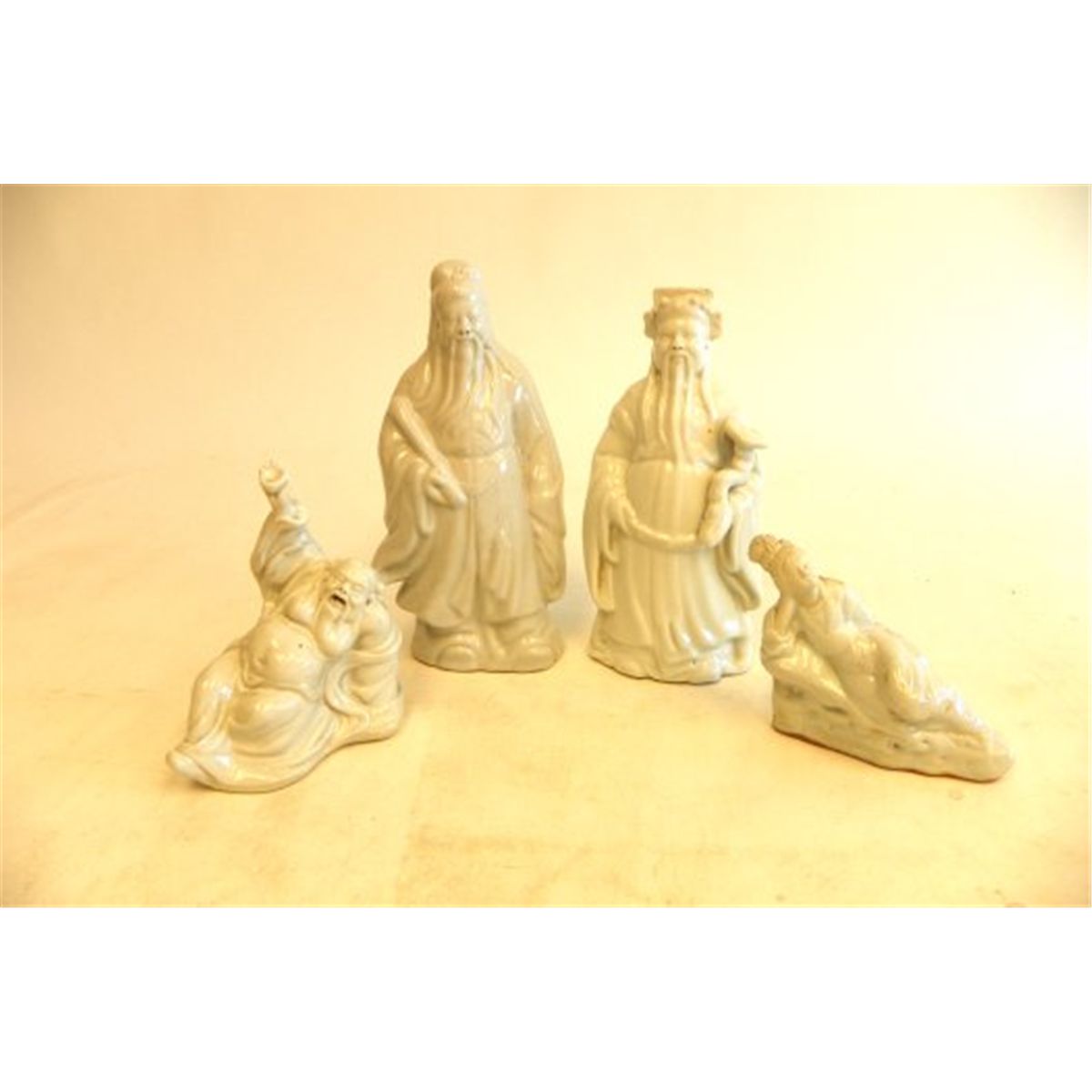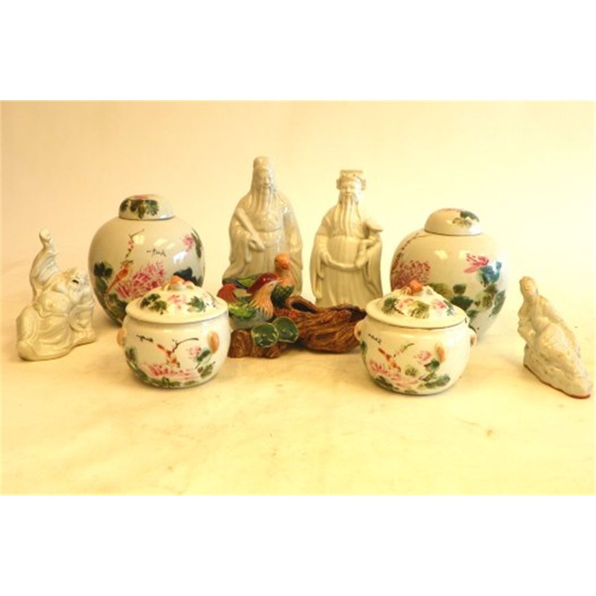 4 jars-smallest 5.5" x 2", largest approx. 8.5" x 2". 4 Blanc de Chine figures, 2 "Men", approx. 11" H & 2 "Reclining Figures", approx. 7" H. Pottery "Birds on Tree Stump", approx. 5" H x 11" L x 5" W.