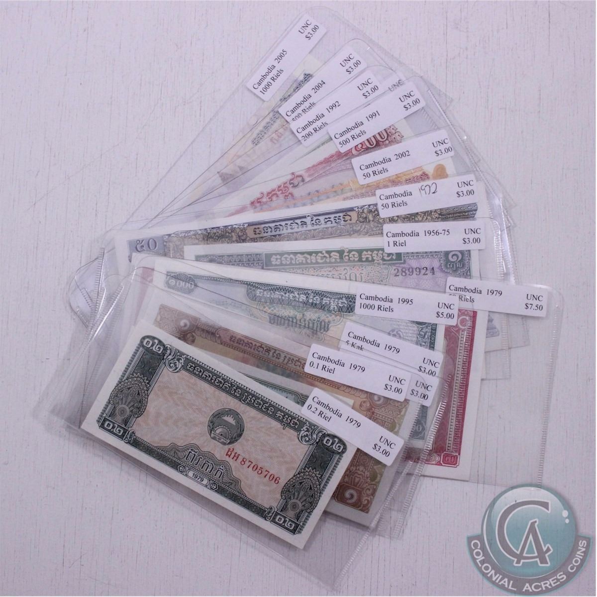 Group lot of fifteen different banknotes from Cambodia in UNC Condition.