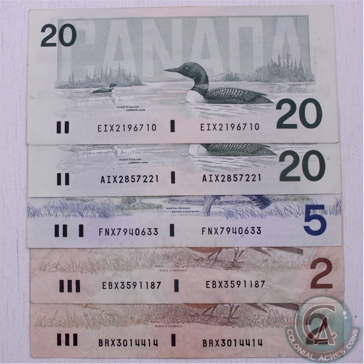 Group lot of five second generation replacement notes from the Bird series in average circulated condition. You will receive the following prefix's; EBX, BRX, FNX, EIX, and AIX