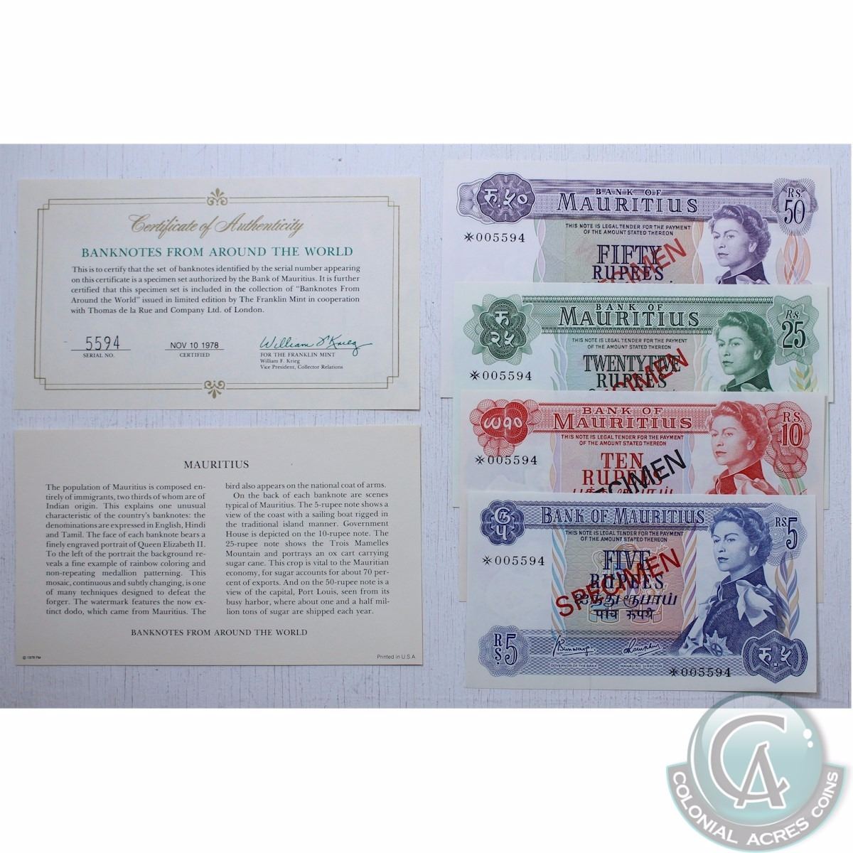 Group lot of four specimen banknotes from Mauritius 1978 UNC Condition. Denominations include 5 Rupees, 10 Rupees, 25 Rupees, and 50 Rupees. 4pcs