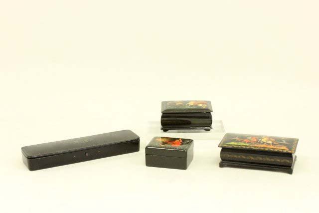 Including 4 painted Russian boxes & one black long box. Various sizes.