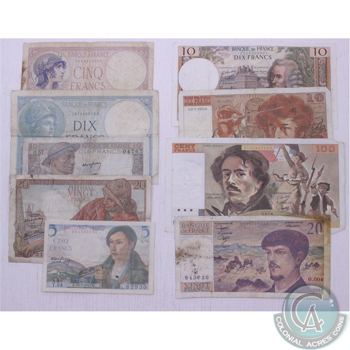 Group lot of nine different banknote from France, notes range in date from 1939 to 1980.