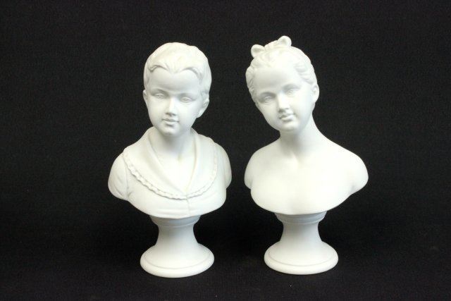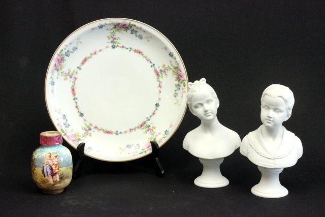 Including: Royal Bonn paint decorated vase, approx. 4.75" H. Pair bisque busts of "Children", approx. 9" H. Limoges charger, approx. 12.5" Diam. Good condition.