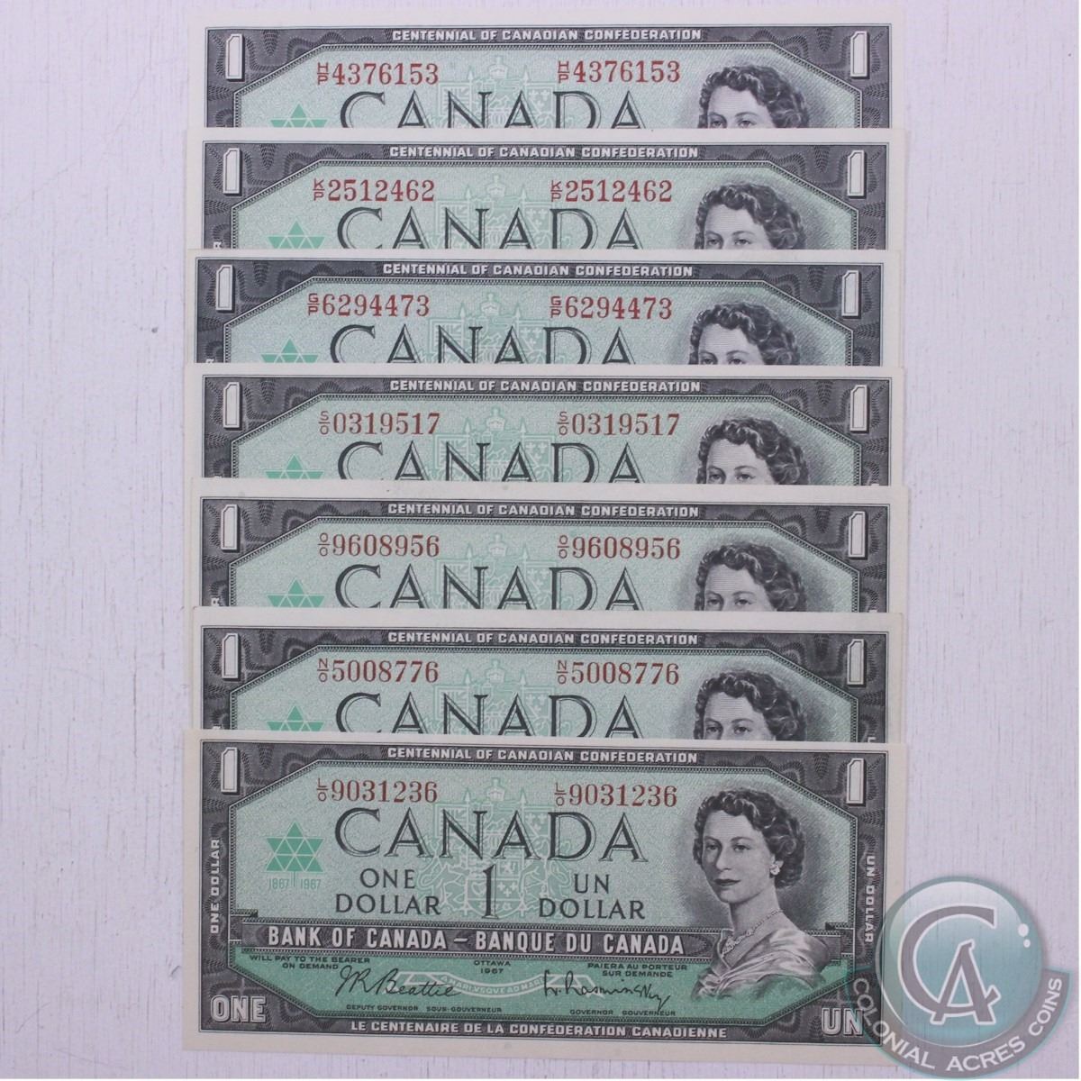 Group lot of seven 1967 Canada $1.00 notes with seven different prefix's all in UNC or better condition.