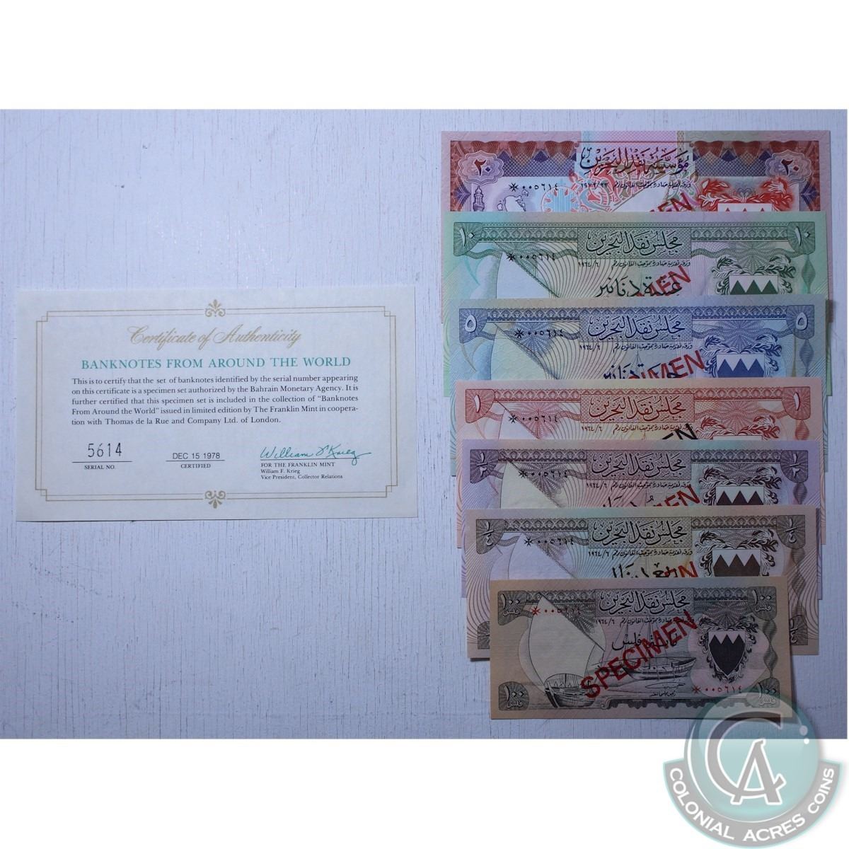 Group lot of seven specimen banknotes Bahrain 1978 UNC Condition. Denominations include 100 Fils, 1/4 Dinar, 1/2 Dinar, 1 Dinar, 5 Dinars, 10 Dinars, and 20 Dinars. 7pcs
