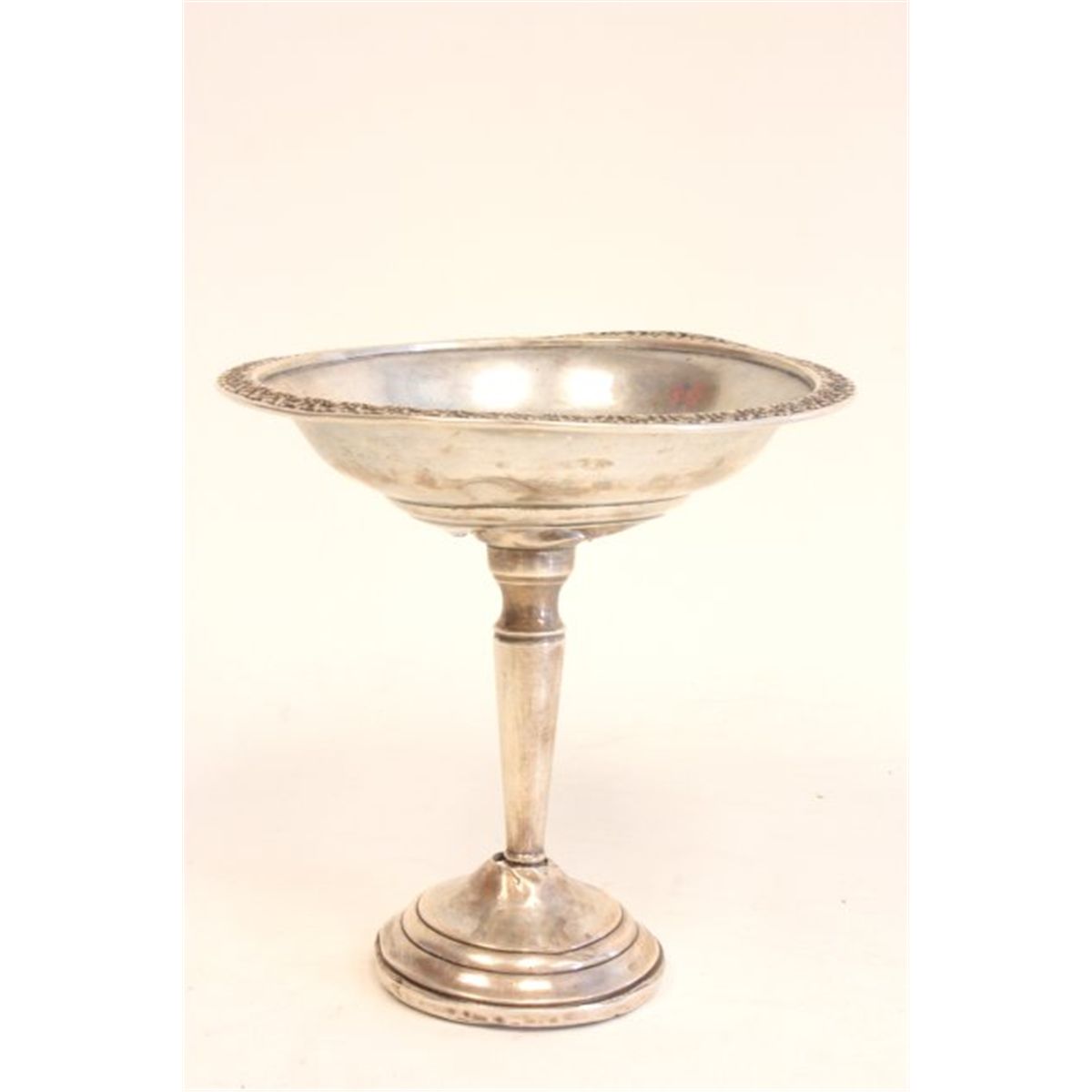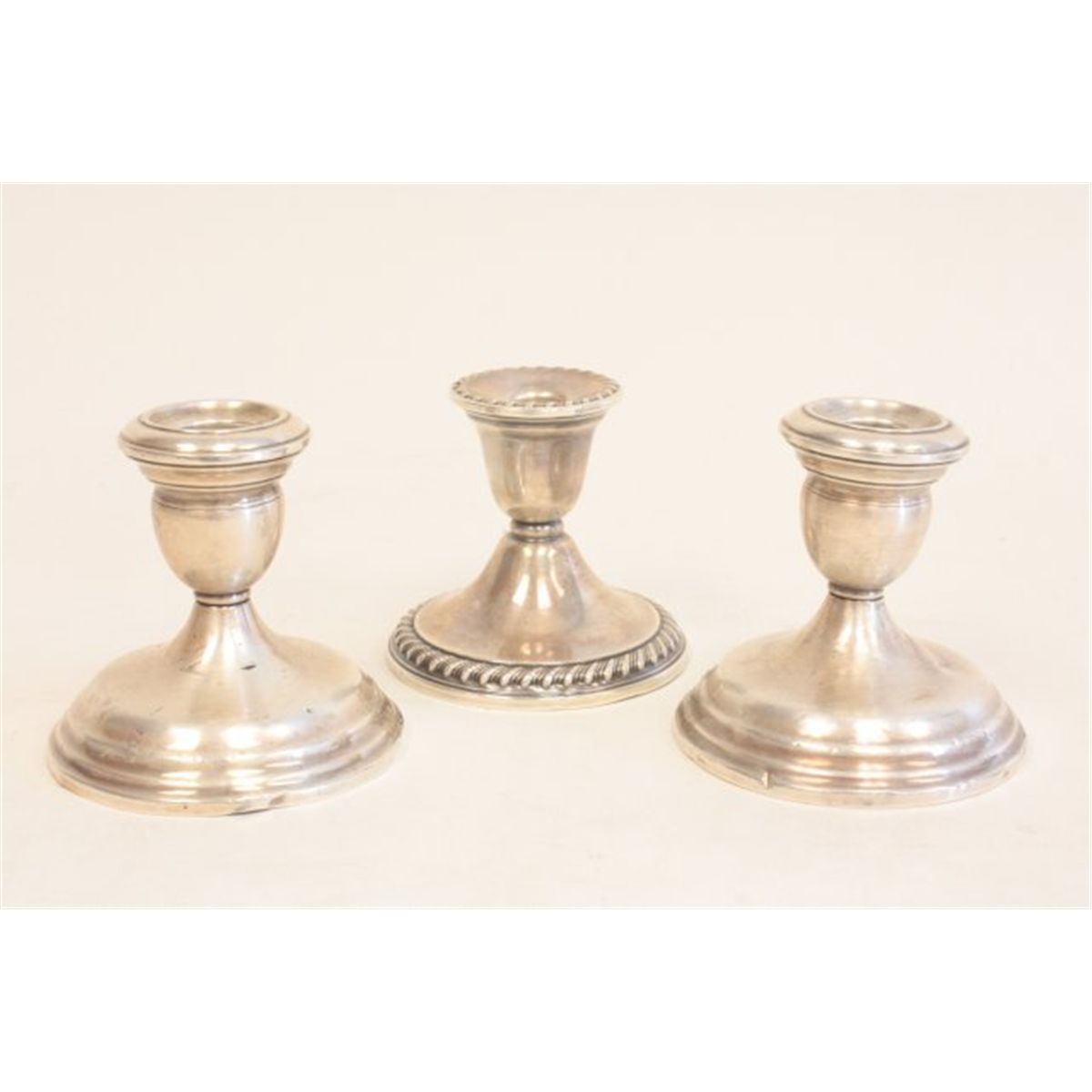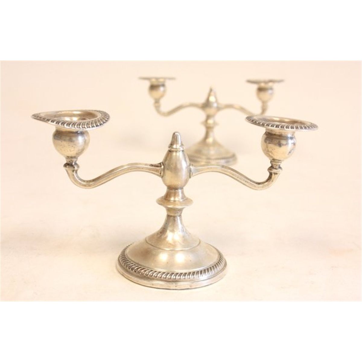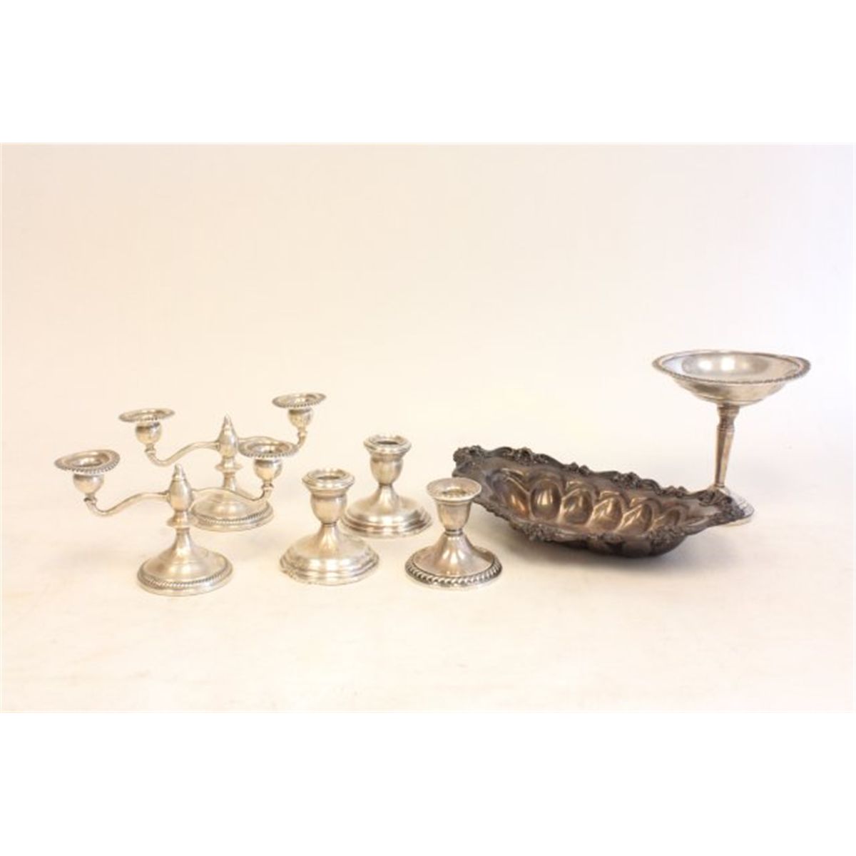 Including: 1- Pair weighted candelabrum dented.   3- Weighted candelabrum, dented.  1- Bread tray,  approx. 10 oz.  1- Weighted compote, as is. Please read our terms of sale.