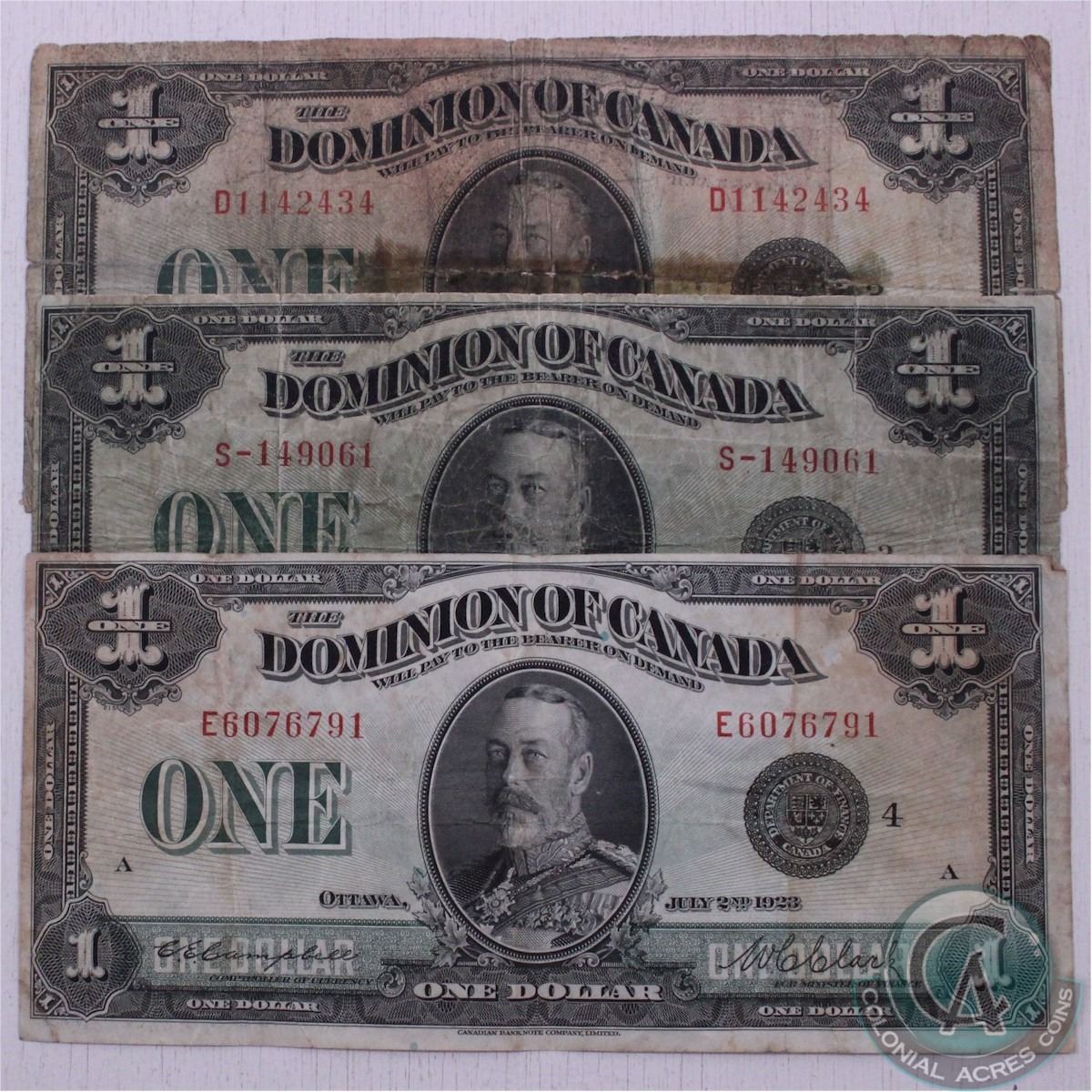 Group lot of three different 1923 $1.00 notes all with a black Seal