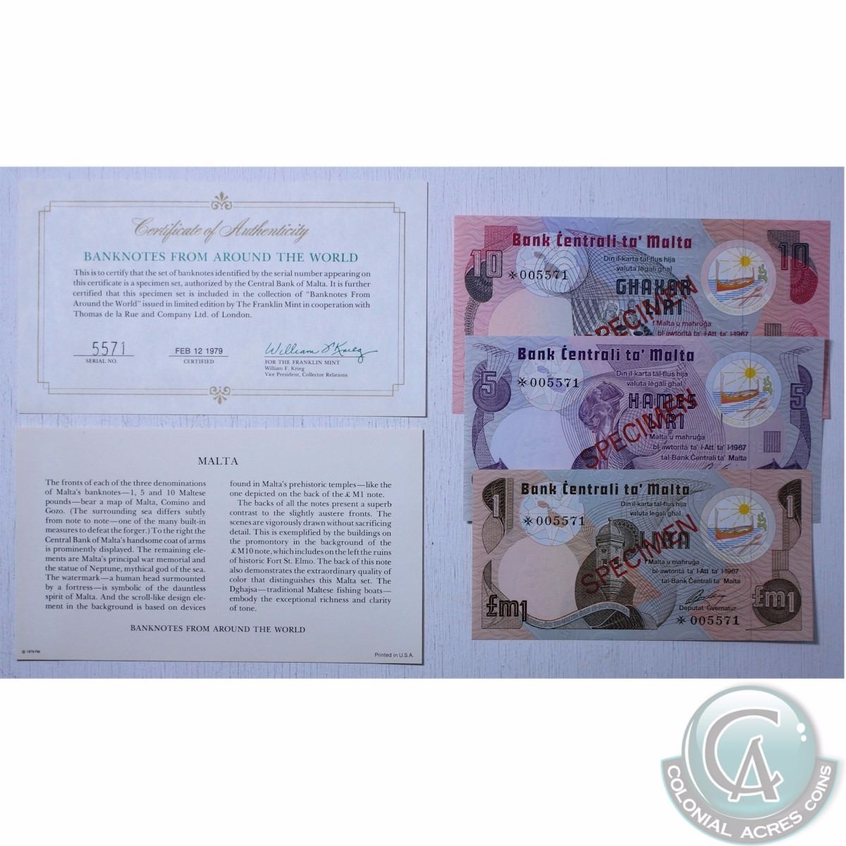 Group lot of three specimen Banknotes from Malta 1979 UNC Condition. Denominations include 1 Lira, 5 Liri, and 10 Liri. 3pcs