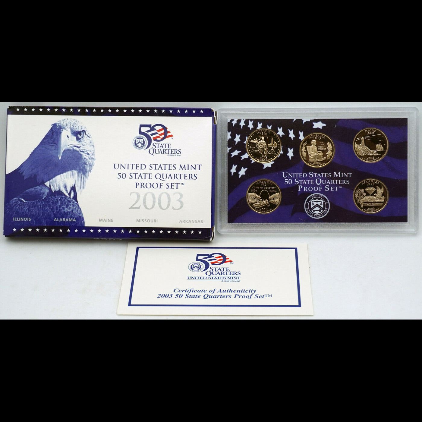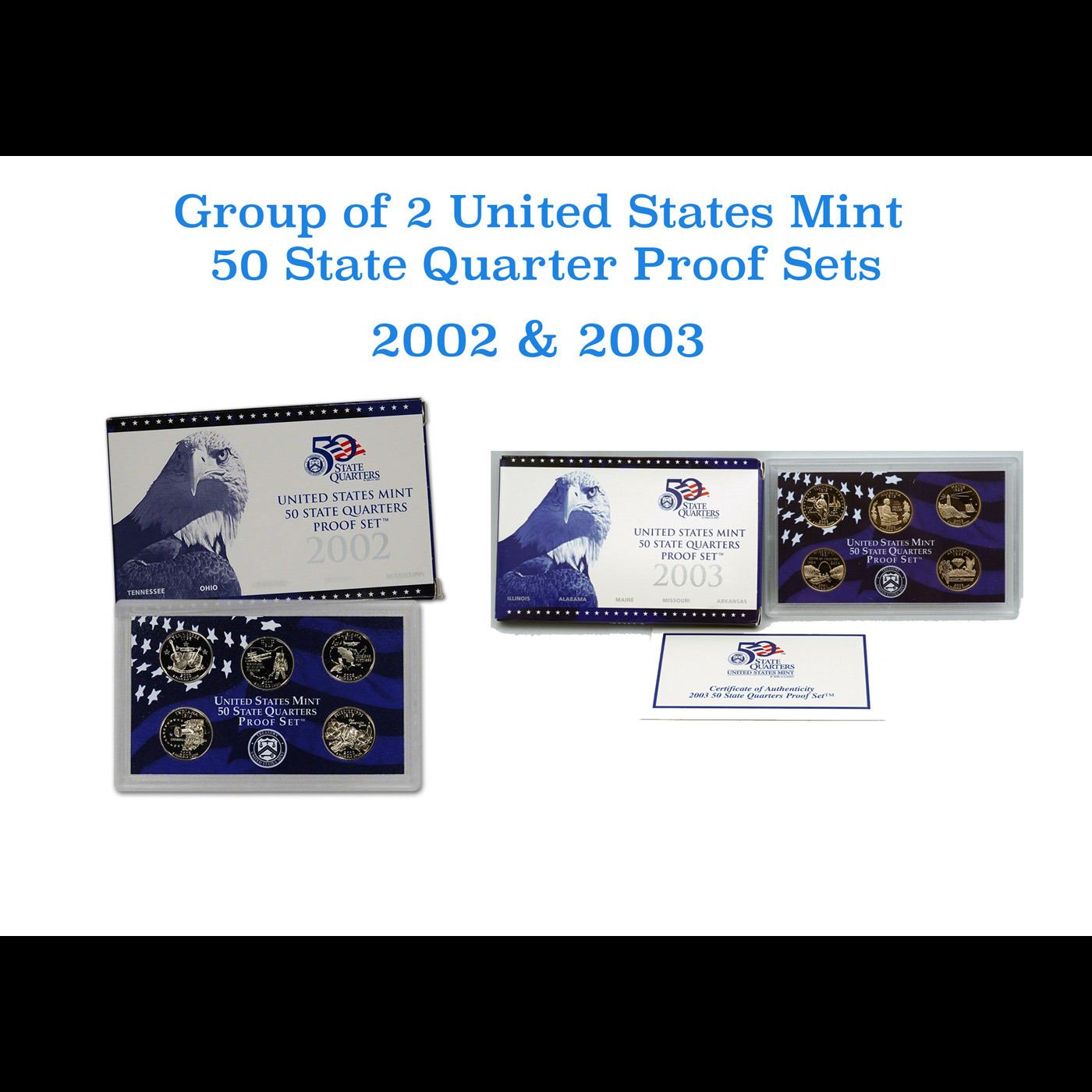 Group of 1 2002-2003 United States Quarters Proof Set - 10 pc set. 2002-2003 United States Quarters Proof Set - 10 pc set Low mintage. Each Set contains 5 Proof State Quarters. They are Tennessee, Indiana, Ohio, Mississippi, Louisian, Illinois, Missouri, Alabama, Arkansas, and Maine. Total of 10 pieces; Complete with Original Packaging and COA.