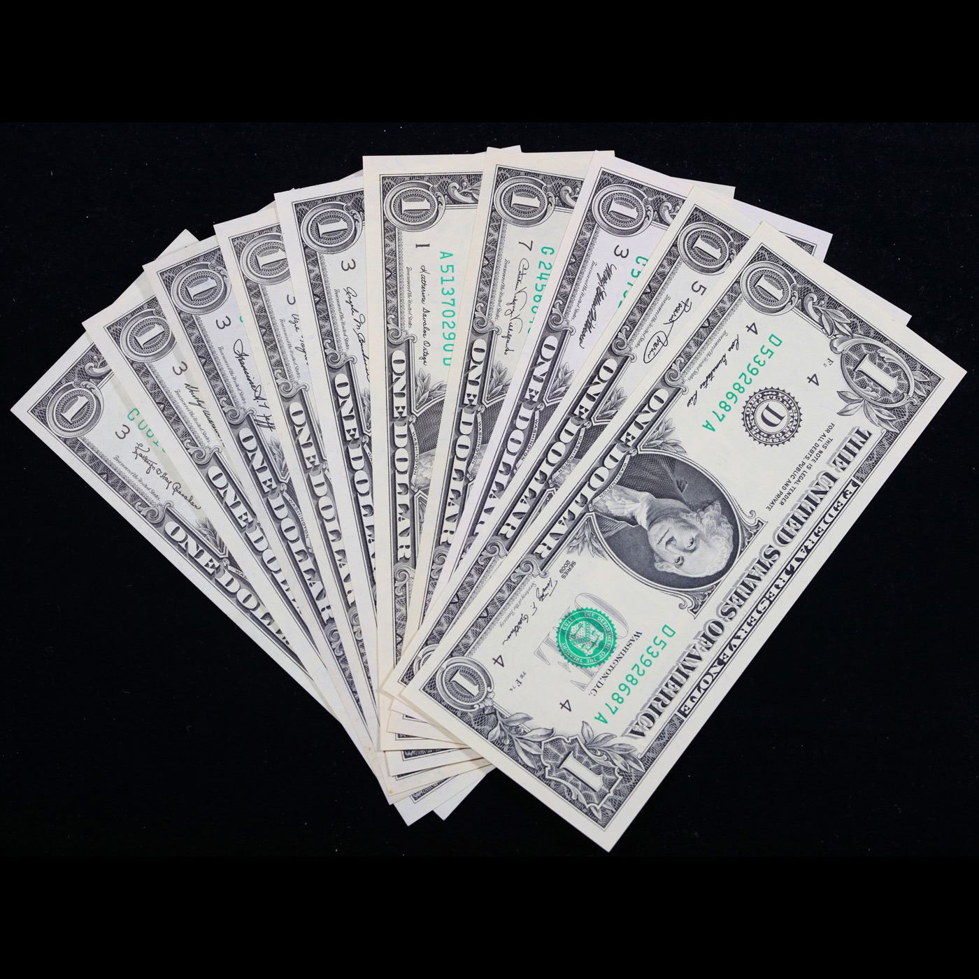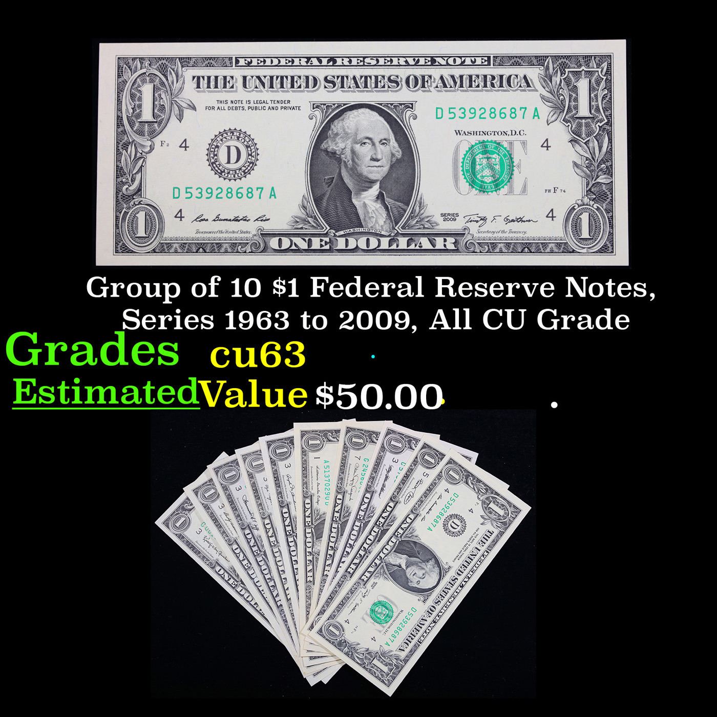 Group of 10 $1 Federal Reserve Notes, Series 1963 to 2009, All CU Grade Grades Select CU.