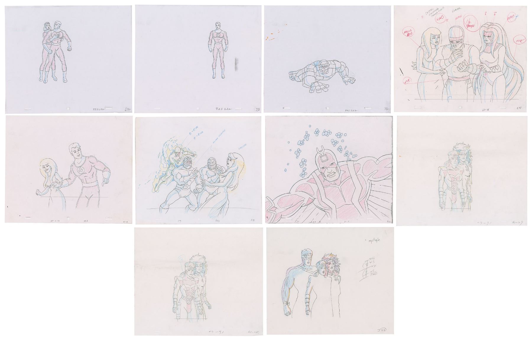 (Marvel Studios, circa 1990s) Group of 10 original production drawings featuring Marvel super heroes from Fantastic Four (7) and X-Men (3), including Johnny Storm (the Human Torch), the Thing, the Inhumans, Medusa, Karnack, Crystal, Phoenix, Rogue, Cyclops, and Black Bolt. Accomplished in graphite and colored pencil on untrimmed 12.5 x 10.5 animation paper. Image sizes range from 2 x 5.5 to 12.5 x 9.75. In overall fine condition. A wonderful lot featuring several of Marvel's most popular comic book characters.