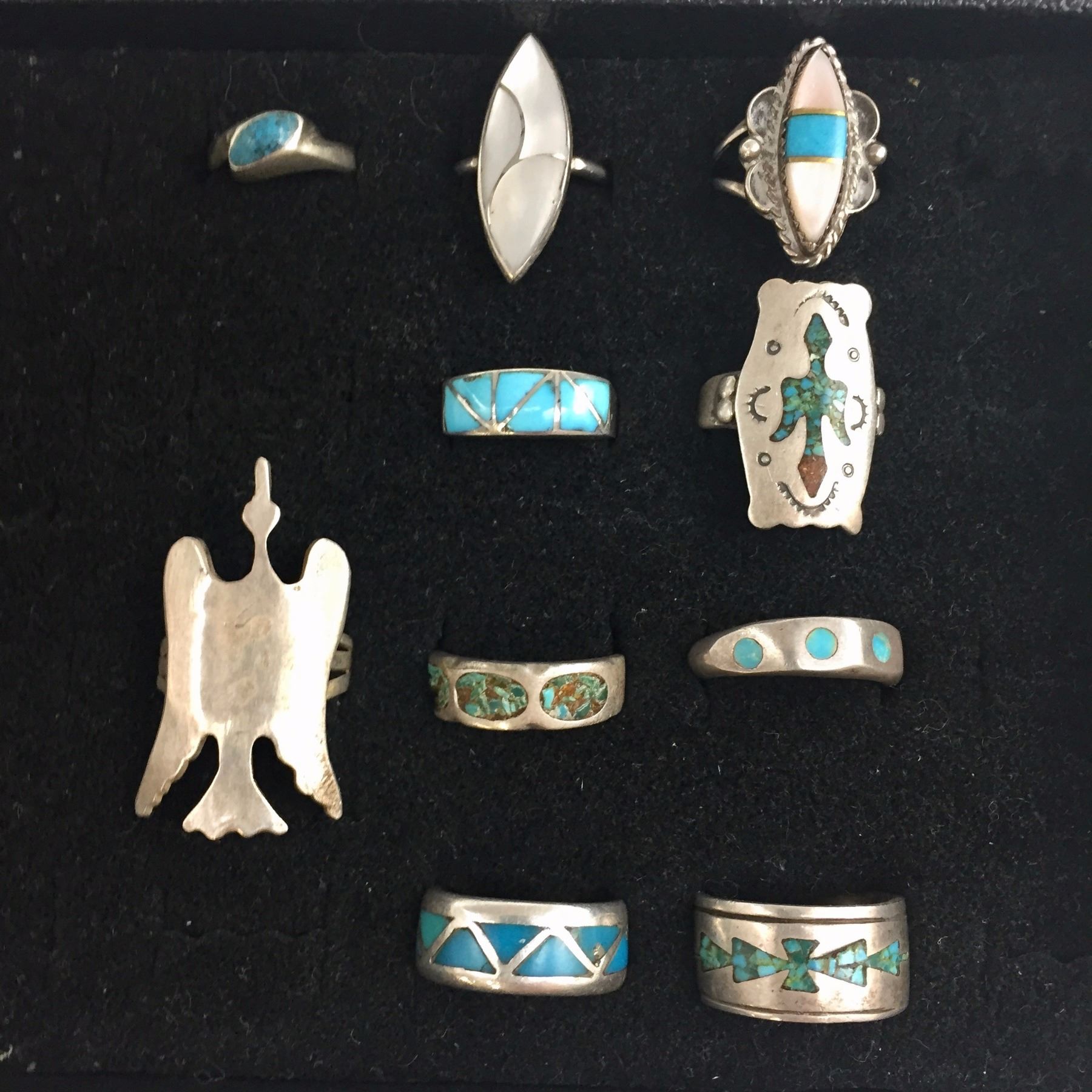 Maker: Various artists. Approx. Age: Vintage. Size: Sizes: 6 (x2), 6.5, 7 (x2), 7.5, 8 (x2), 8.5 (x2). Lot weighs 50.3 g. Additional Info: Group of 10 sterling silver rings of various styles. Condition: Good for their age, normal wear expected. Please look closely at the pictures - they are an important part of our description. Shipping: There will be a $5 handling / packaging fee for shipping this lot. The actual cost of postage will be added on top of that.