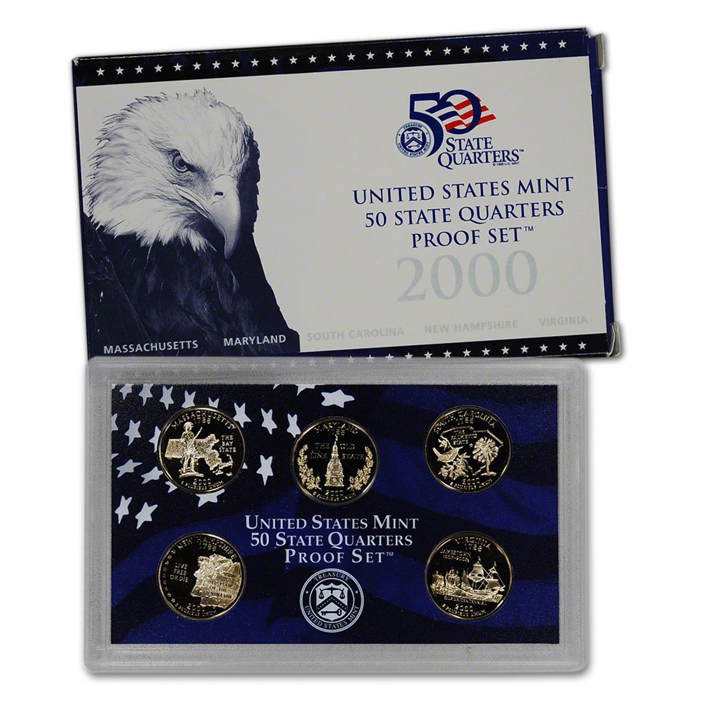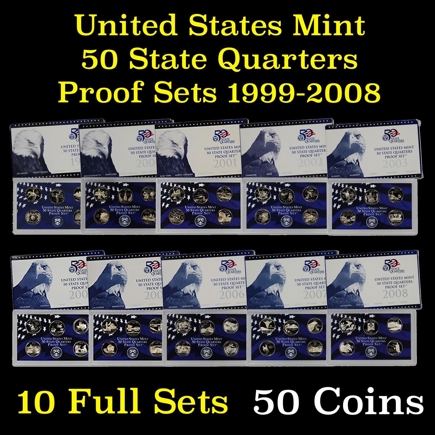 Group of 10 United States Mint Proof Quarters 1999-2008 All 50 State Quarters. A group of 10 United States Mint 50 State Quarter Proof Sets. Dates range from 1999-2008. The 1999 set includes Delaware, Pennsylvania, New Jersey, Georgia and Connecticut. The 2000 set includes Massachusetts, Maryland, South Carolina, New Hampshire, Virginia. The 2001 set includes New York, North Carolina, Rhode Island, Vermont, and Kentucky. The 2002 set includes Tennessee, Ohio, Louisiana, Indiana, and Mississippi. The 2003 set includes Illinois, Alabama, Maine, Missouri, and Arkansas. The 2004 set includes Michigan, Florida, Texas, Iowa and Wisconsin. The 2005 set includes California, Minnesota, Oregon, Kansas and West Virginia. The 2006 set includes Nevada, Nebraska, Colorado, North Dakota and South Dakota. The 2007 set includes Montana, Washington, Idaho, Wyoming and Utah. The 2008 set includes Oklahoma, New Mexico, Arizona, Alaska and Hawaii. All proof, all in the original mint packaging, all prisitne and perfect. Includes all 50 state quarters