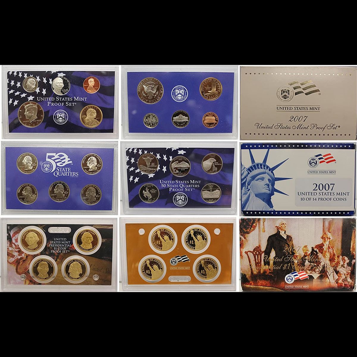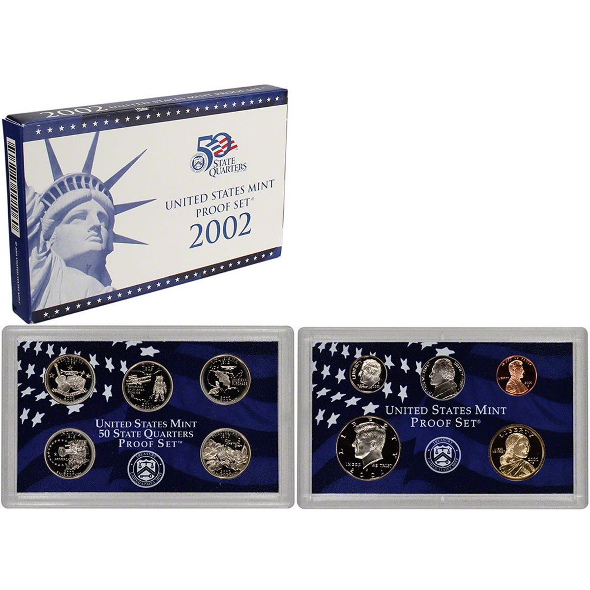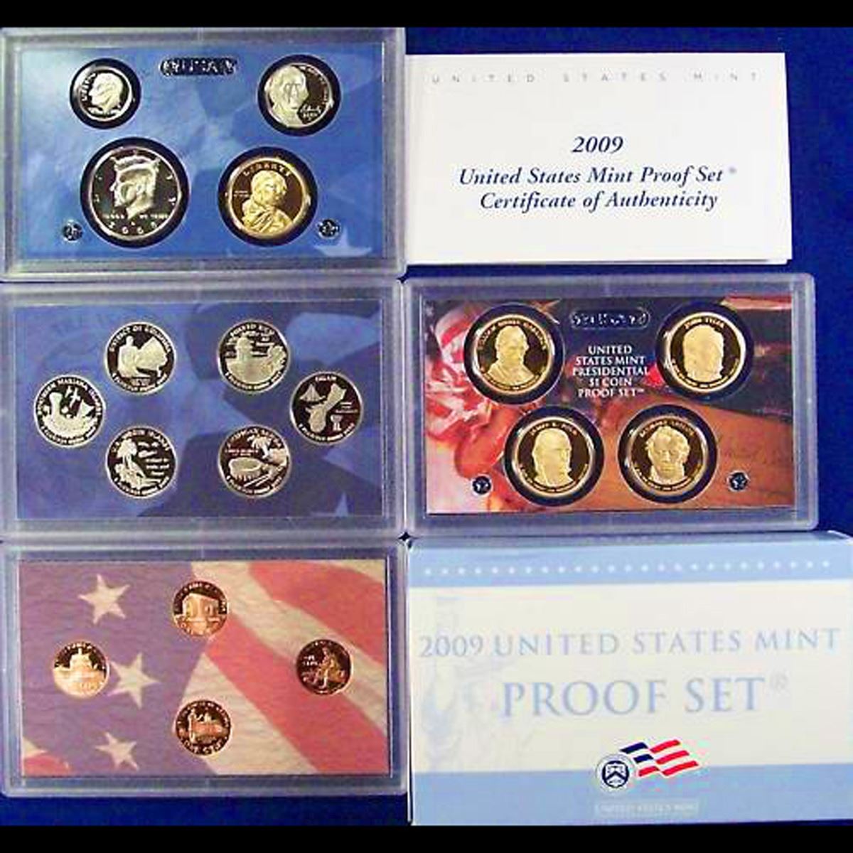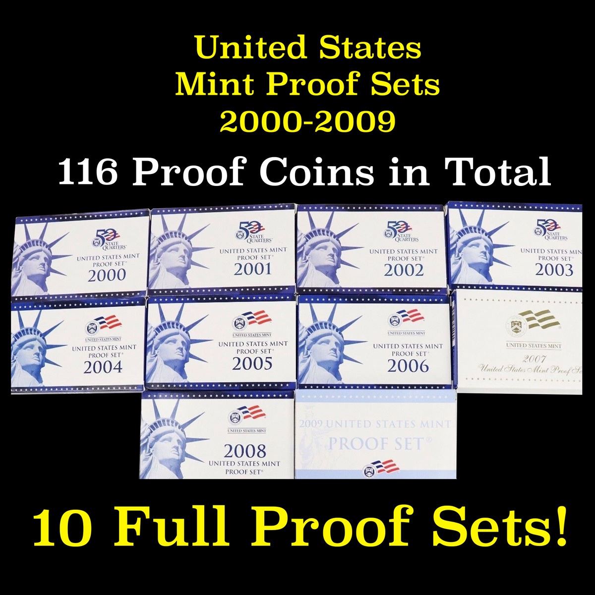Group of 10 United States Mint Proof Sets 2000-2009 116 coins. Great grouping of 10 United States Mint proof sets. Each set from 2000-2009 contains a proof Lincoln cent, proof Jefferson nickel, proof Roosevelt dime, 5 proof Washington quarters, a proof Kennedy half dollar, and a proof Sacagawea dollar. In addition starting in 2007 the sets also include 4 Presidential proof dollars. The 2009 set has 4 proof Lincoln cents the complete 'Life of Lincoln' series and an additional proof quarter. There are 6 quarters in the 2009 set. Complete with Original Packaging and COA. A total of 116 coins.
