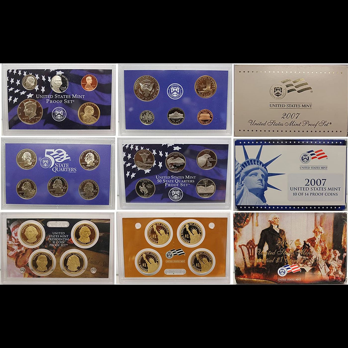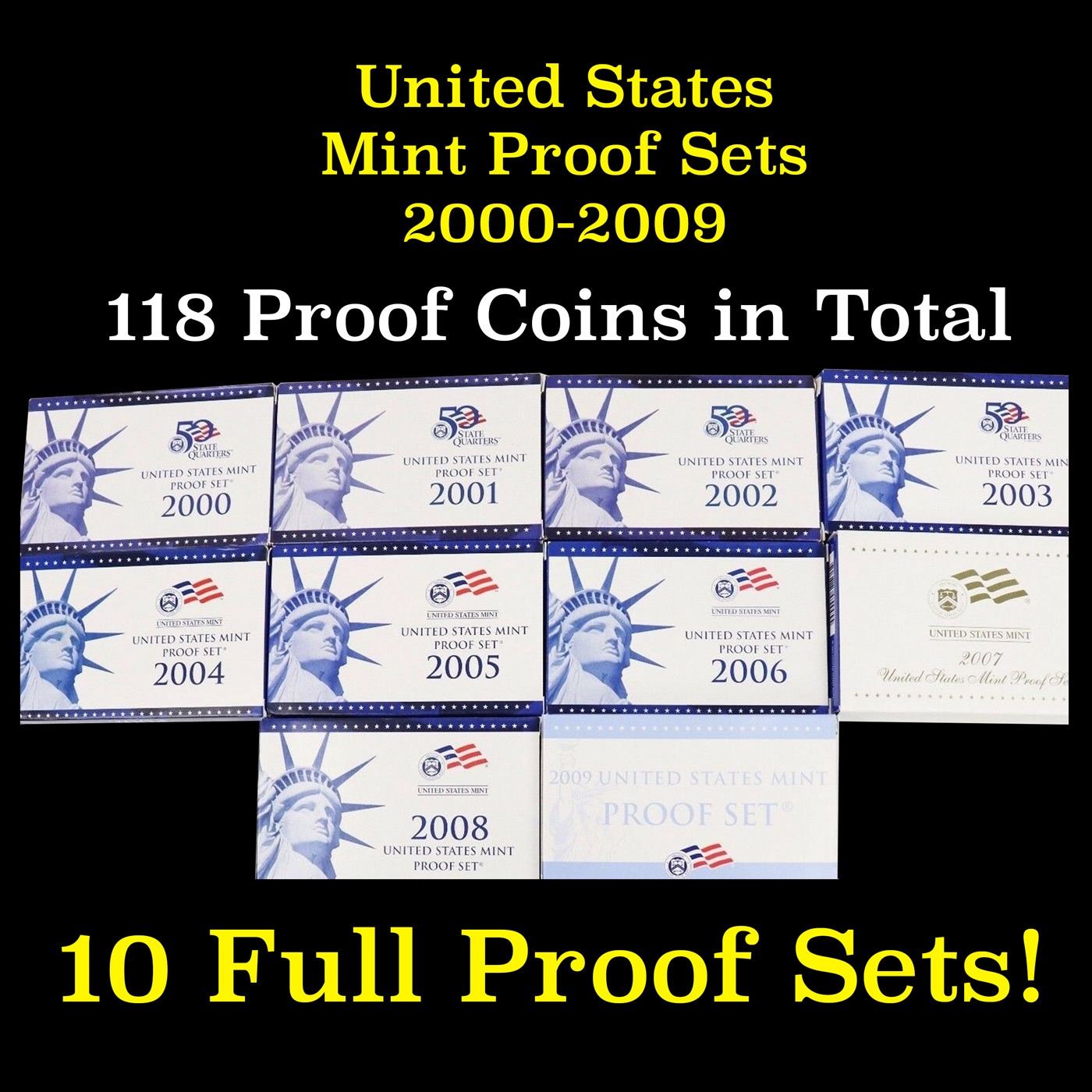Group of 10 United States Mint Proof Sets 2000-2009 Grades. The 2000 Set contains 5 Proof State Quarters, a Proof Half Dollar, a Proof Dime, as well as 3 additional Proof coins Including the Sacagawea Proof Dollar coin. Complete with Original Packaging and COA. The 2001 Set contains 5 Proof State Quarters, a Proof Half Dollar, a Proof Dime, as well as 3 additional Proof coins Including the Sacagawea Proof Dollar coin. Complete with Original Packaging and COA. The 2002 Set contains 5 Proof State Quarters, a Proof Half Dollar, a Proof Dime, as well as 3 additional Proof coins Including the Sacagawea Proof Dollar coin. Complete with Original Packaging and COA. The 2003 Set contains 5 Proof State Quarters, a Proof Half Dollar, a Proof Dime, as well as 3 additional Proof coins Including the Sacagawea Proof Dollar coin. Complete with Original Packaging and COA. The 2004 Set contains 5 Proof State Quarters, a Proof Half Dollar, a Proof Dime, as well as 3 additional Proof coins Including the Sacagawea Proof Dollar coin. Complete with Original Packaging and COA. The 2005 Set contains 5 Proof State Quarters, a Proof Half Dollar, a Proof Dime, as well as 3 additional Proof coins Including the Sacagawea Proof Dollar coin. Complete with Original Packaging and COA. The 2006 Set contains 5 Proof State Quarters, a Proof Half Dollar, a Proof Dime, as well as 3 additional Proof coins Including the Sacagawea Proof Dollar coin. Complete with Original Packaging and COA. The 2007 Set contains 4 Proof Presidential Dollars Including the Inaugural first 4, Washington through Madison, 5 90% Silver Proof State Quarters, a 90% Silver Proof Kennedy Half Dollar, a 90% Silver Proof Roosevelt Dime, as well as 3 additional Proof coins Including the Sacagawea Proof Dollar coin. Complete with Original Packaging and COA. The 2008 Set contains 4 Proof Presidential Dollars Including the Inaugural first 4, Washington through Madison, 5 Proof State Quarters, a Proof Kennedy Half Dollar, a Proof Roosevelt Dime, as well as 3 additional Proof coins Including the Sacagawea Proof Dollar coin. Complete with Original Packaging and COA. The 2009 Set contains The Brand New 4 Proof Lincoln Cents showing the Various times of his life, 6 Proof Territorial Quarters, 4 Presidential Proof Dollars, a Proof Kennedy Half Dollar, a Proof Roosevelt Dime, as well as 3 additional Proof coins Including the Sacagawea Proof Dollar coin. Complete with Original Packaging and COA.