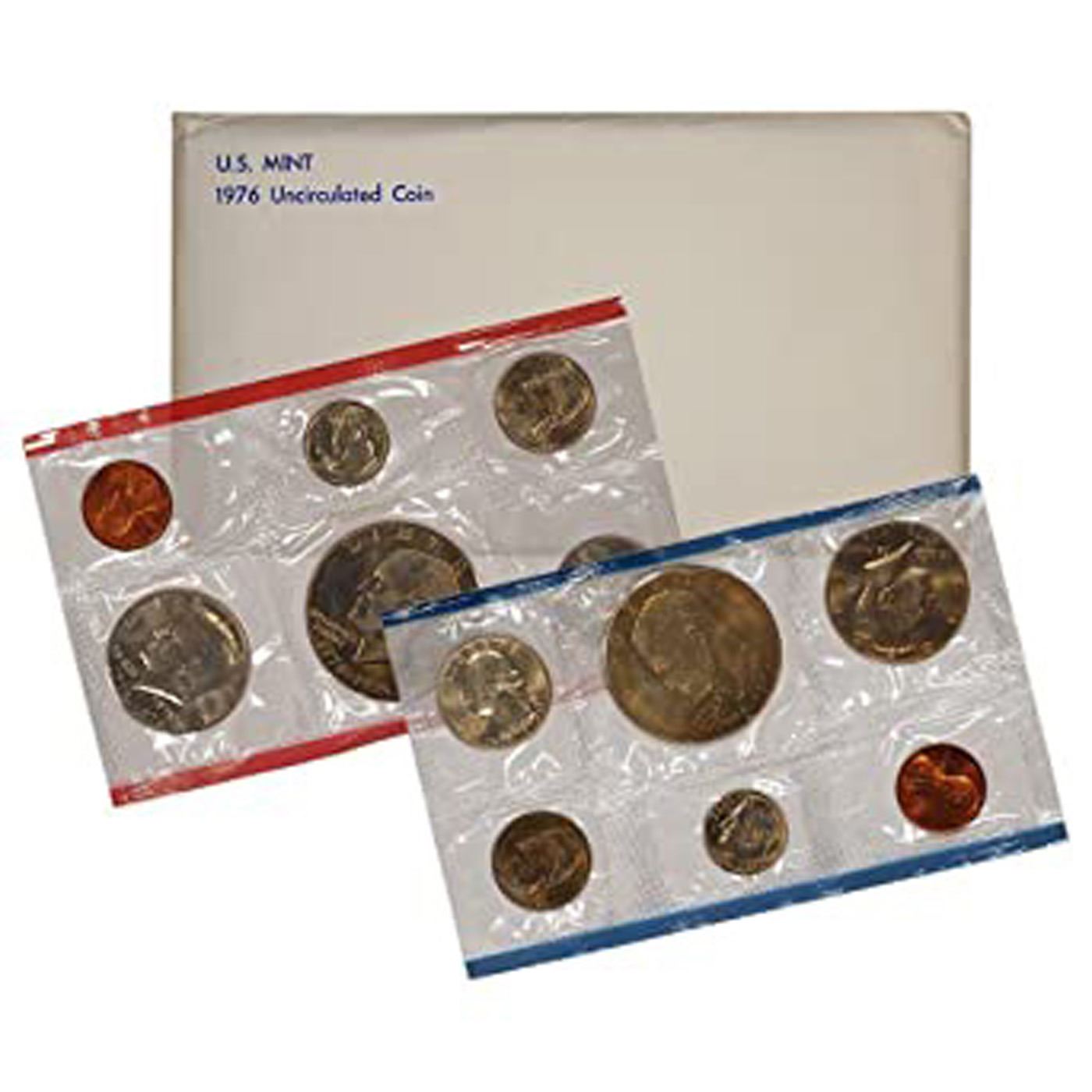 Group of 10 United States Mint Uncurculated Coin Sets In Original Government Packaging 1970-1979 117 coins. The 1970-1972 set has all 10 coins, the full P & D run. In the original mint cellophane with the envelope. 1973-78 also includes 2 Eisenhower Dollars, and 1979 has a Susan B. Anthony Dollar.
