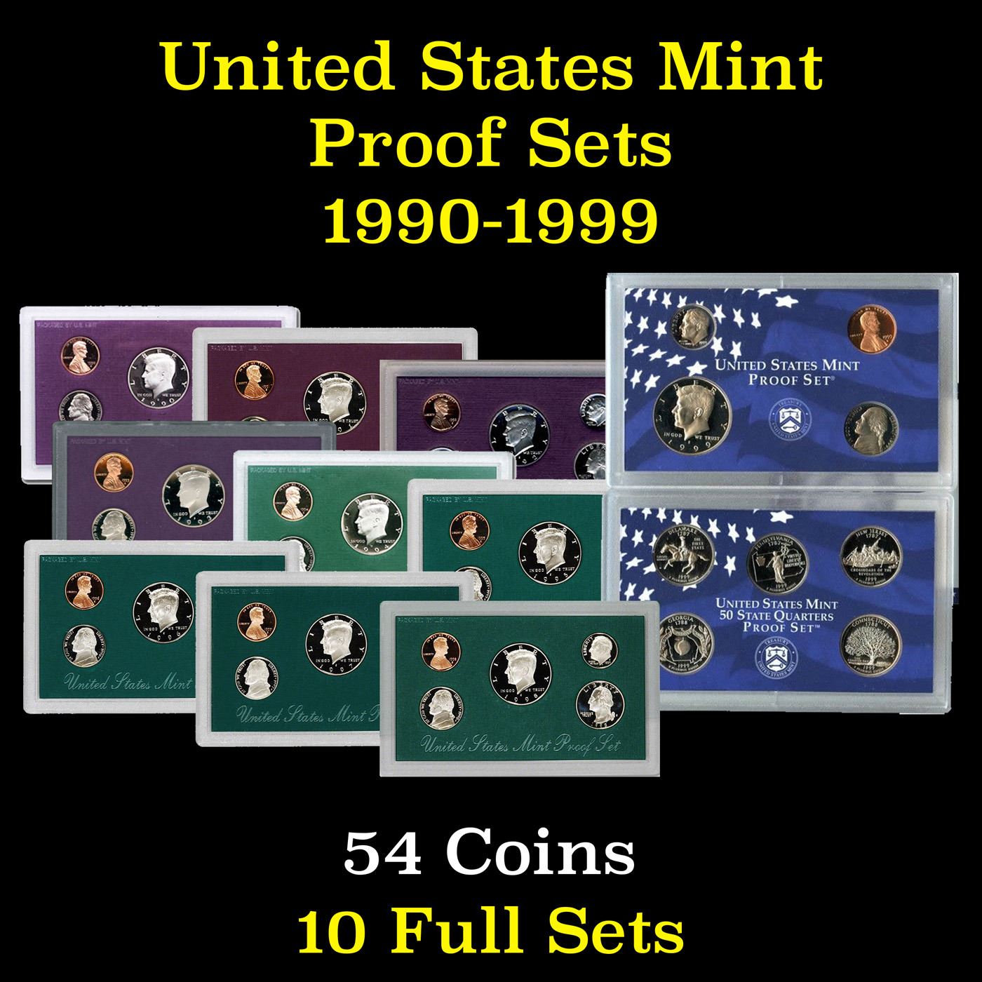 Group of 10 United States Proof Sets 1990-1999 100 coins.        Group of 10 United States Proof Sets. Dates Range from 1990-1999.1990-1998 sets Includes 5 Very Deep Cameo Proof Coins, the original Mint Packaging and the COA. The 1999 set The Set contains 5 Proof State Quarters, a Proof Half Dollar, a Proof Dime, as well as 2 additional Proof coins.  Complete with Original Packaging and COA.