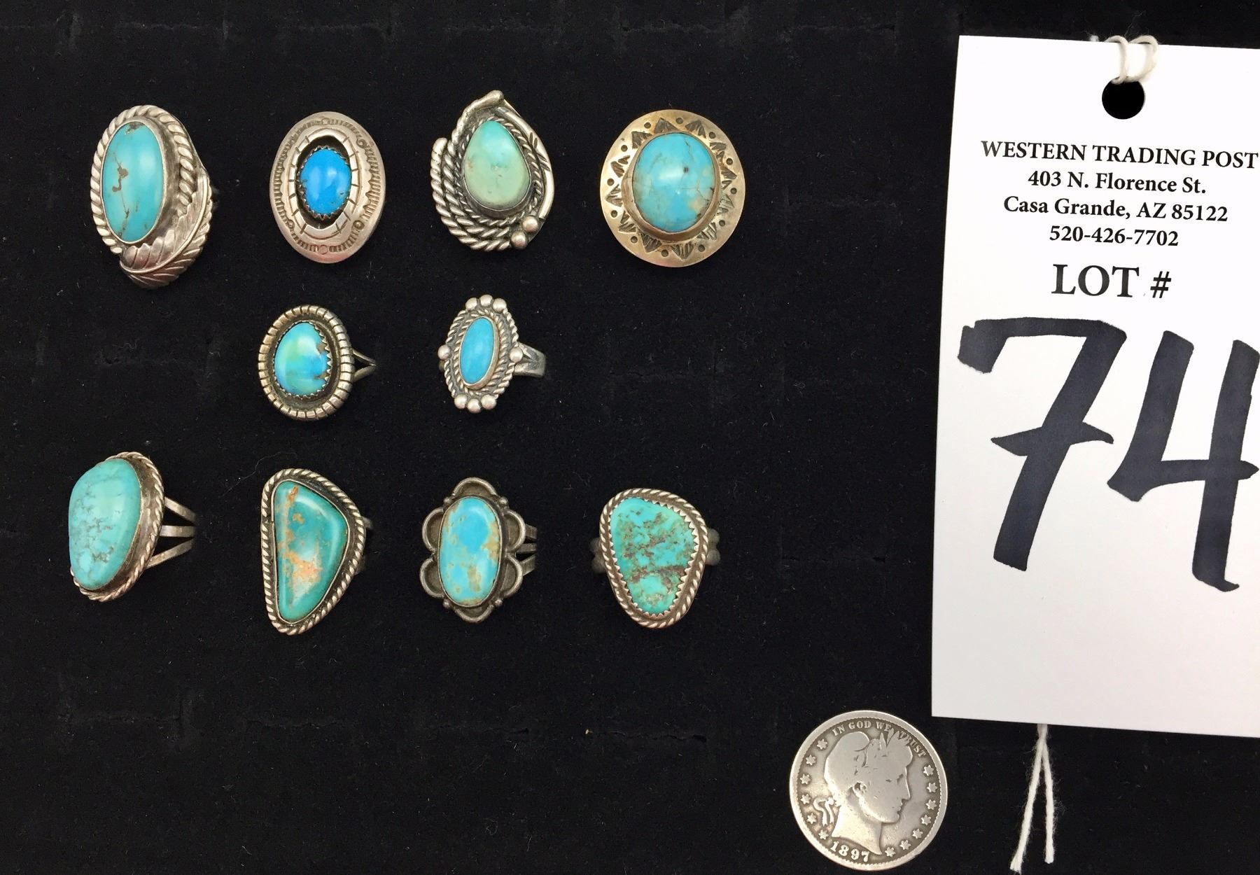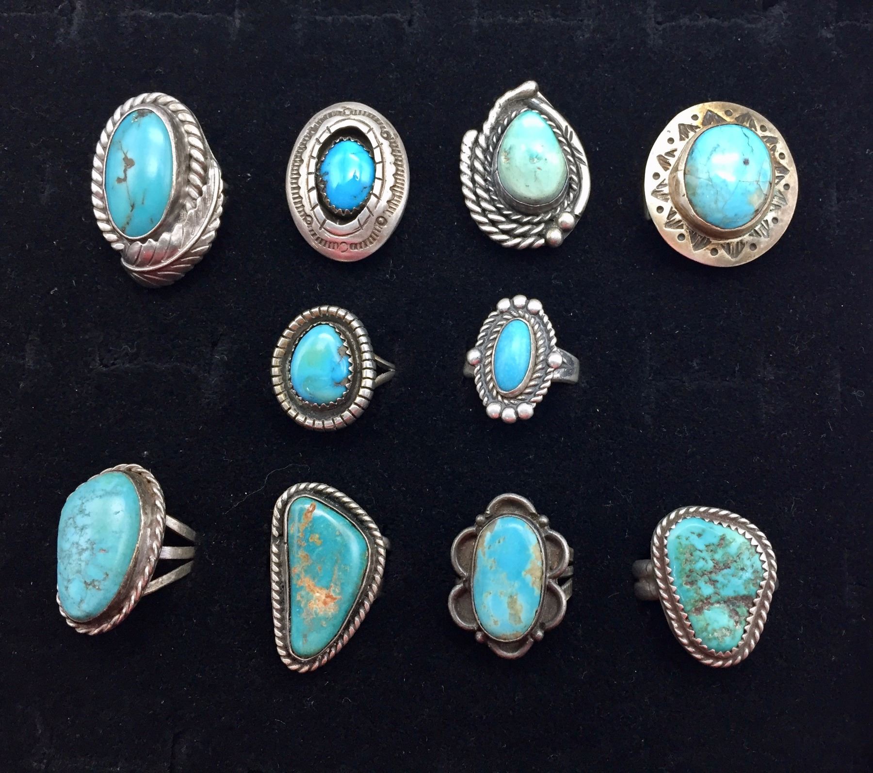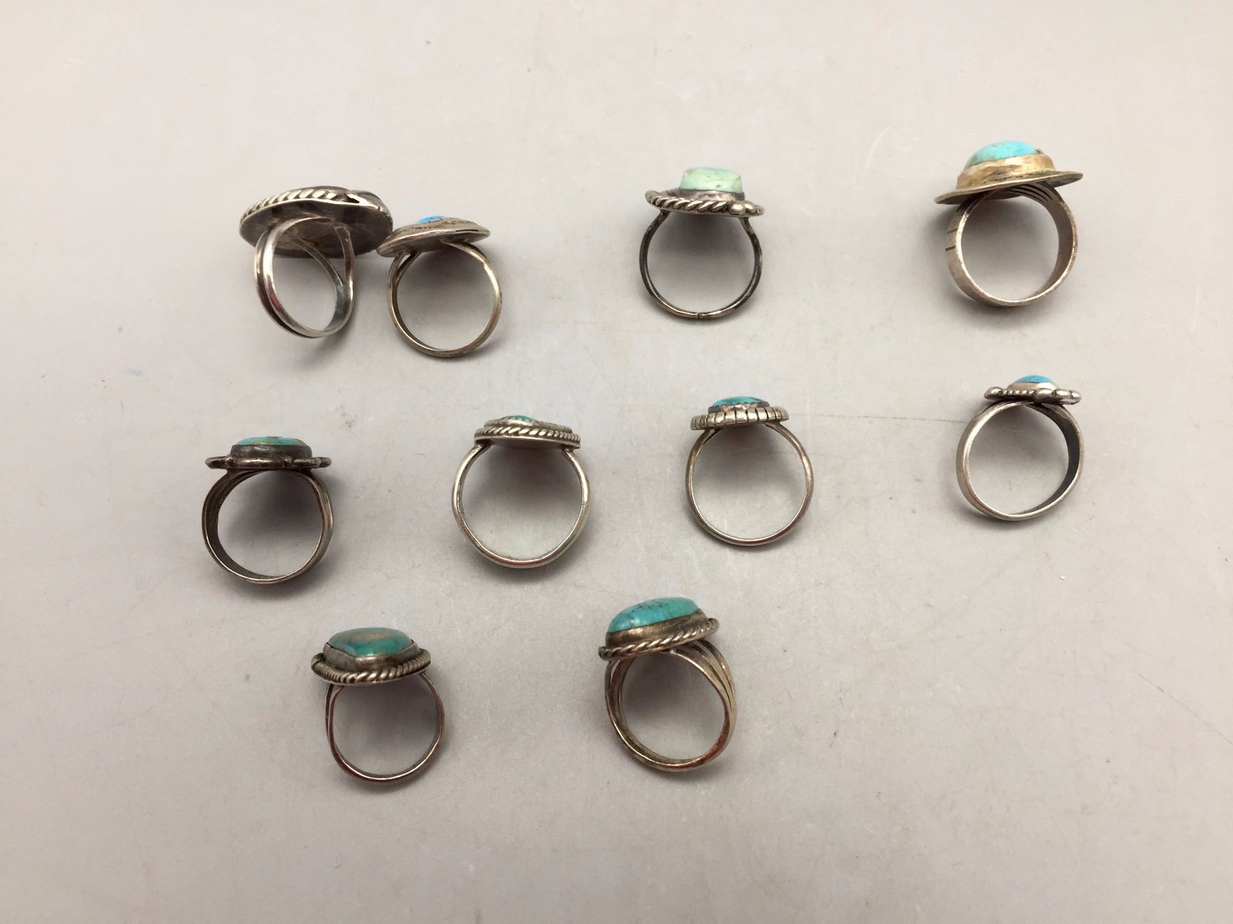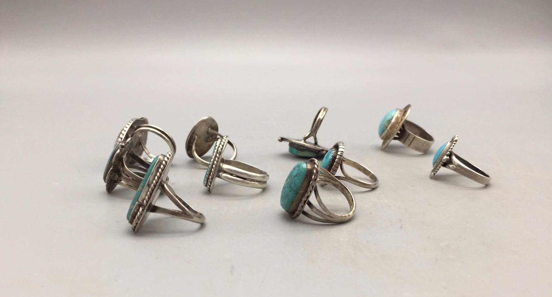 Description: Group of 10 vintage turquoise and sterling silver rings. Maker: Various. Approx. Age: 1970s - 1980s. Size: Varies.. Combined weight of 65 grams. Condition: Good for its age, normal wear expected. Please look closely at the pictures - they are an important part of our description. Shipping: There will be a $5 handling / packaging fee for shipping this lot. The actual cost of postage will be added on top of that.