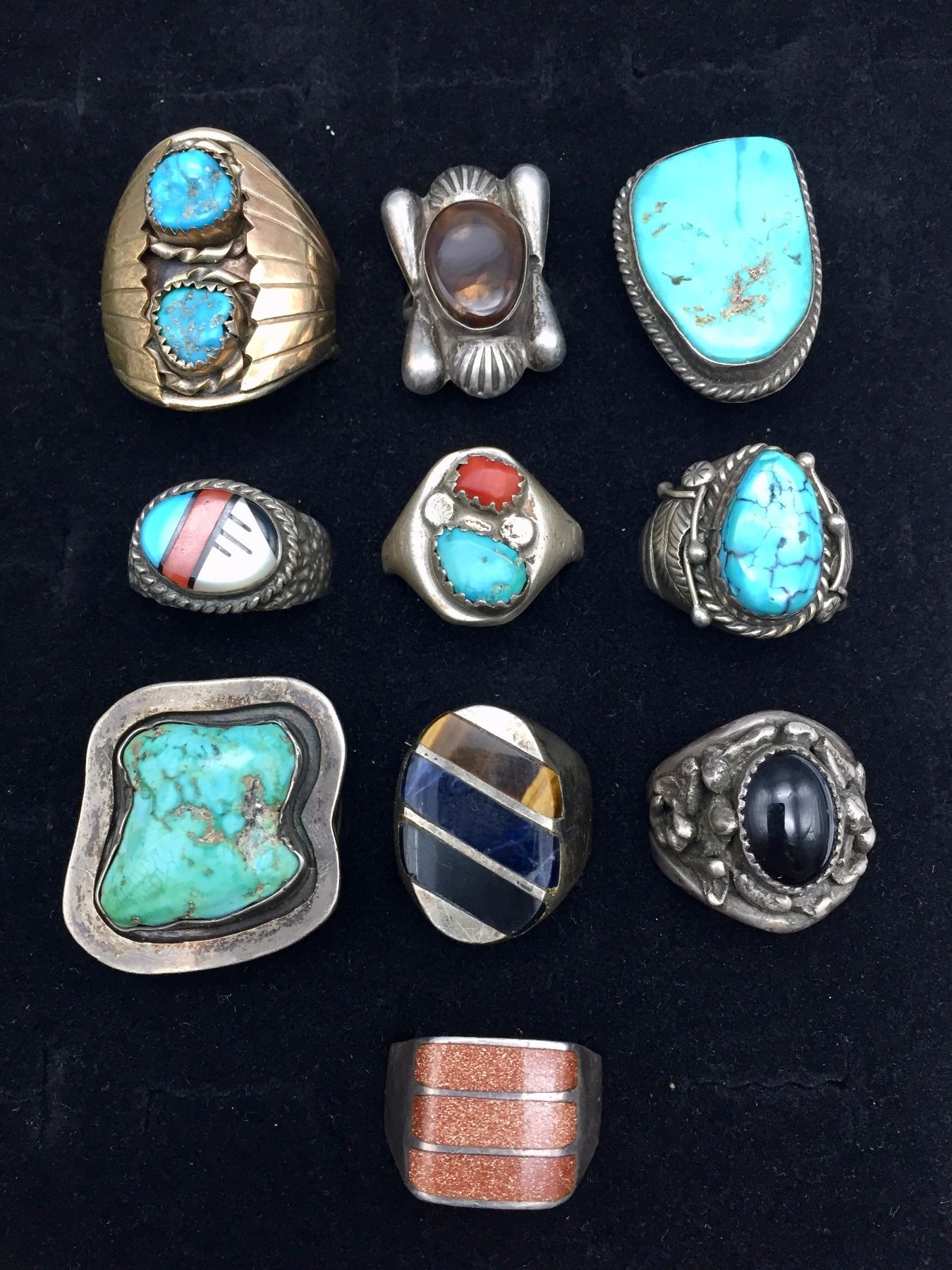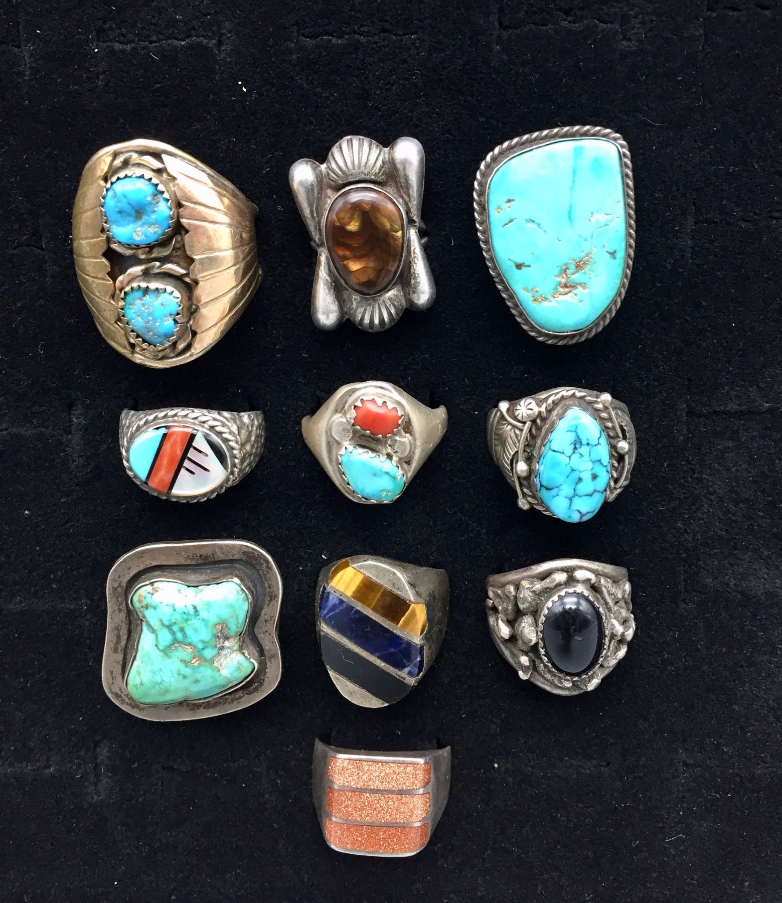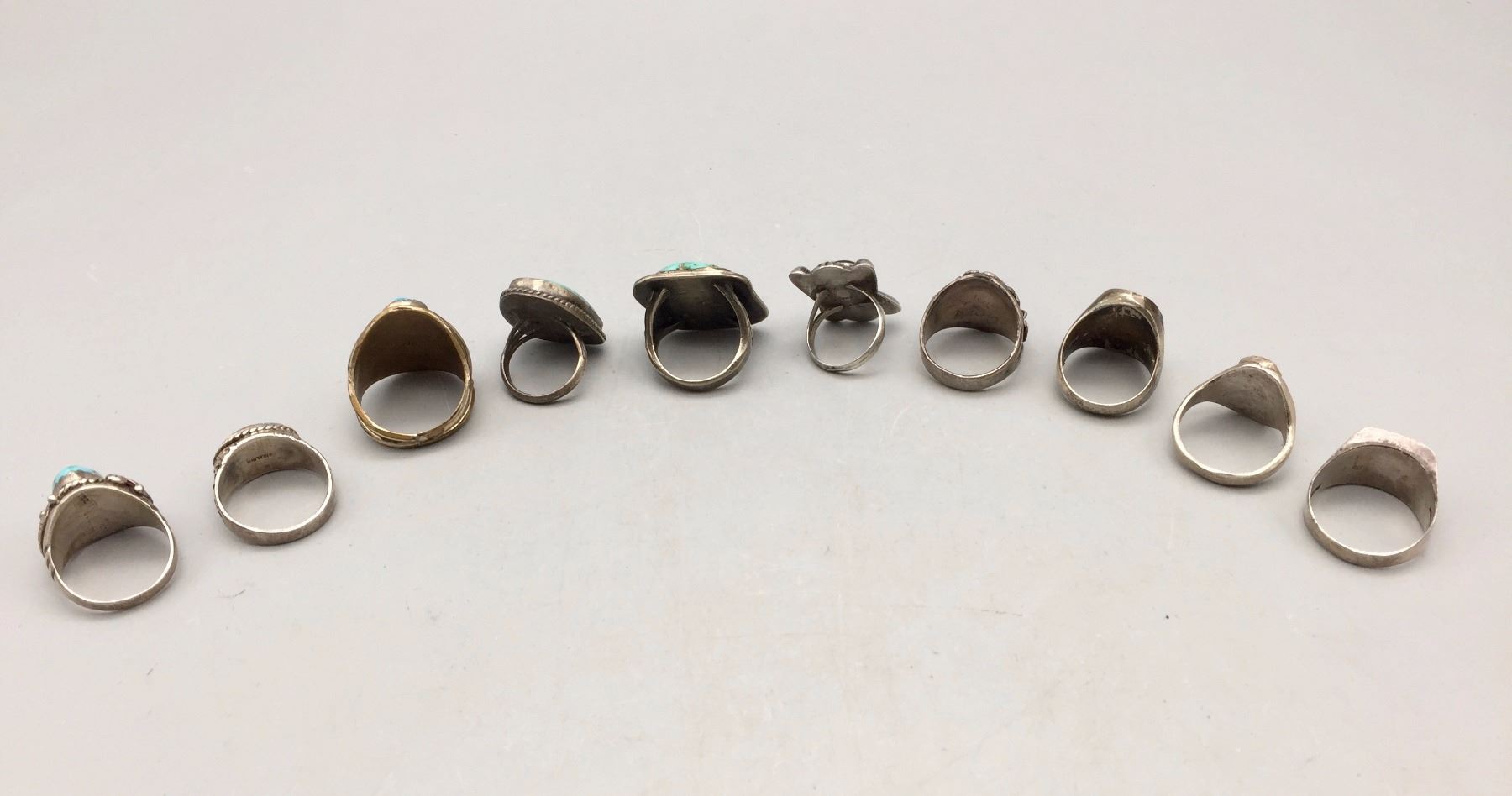 Description: Group of 10 vintage rings in various styles and sizes. All are sterling. Maker: Varies, mostly Navajo style. Approx. Age: Varies, mostly vintage. Size: Varies. Condition: Good for its age, normal wear expected. Please look closely at the pictures - they are an important part of our description. Shipping: There will be a $5 handling / packaging fee for shipping this lot. The actual cost of postage will be added on top of that.
