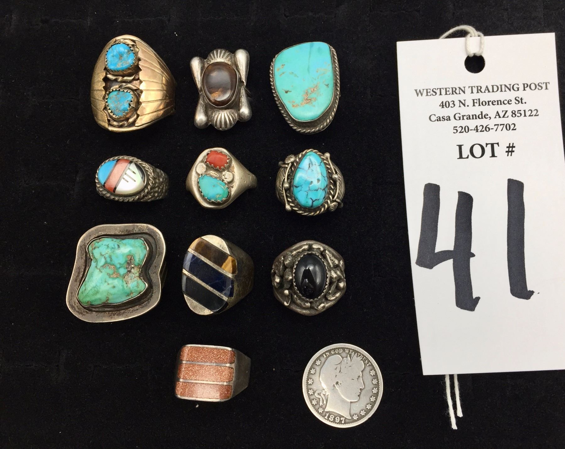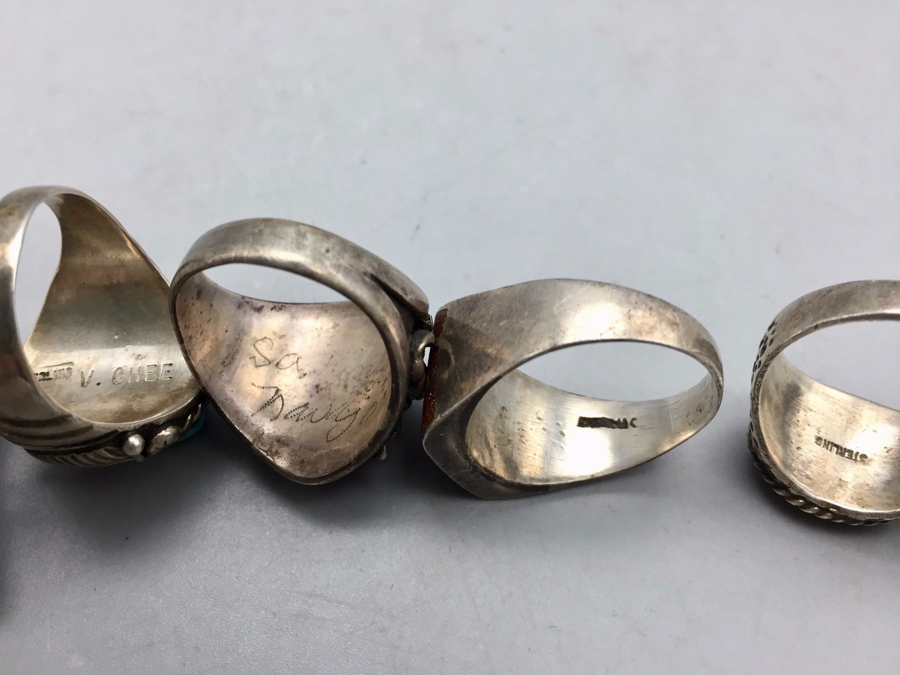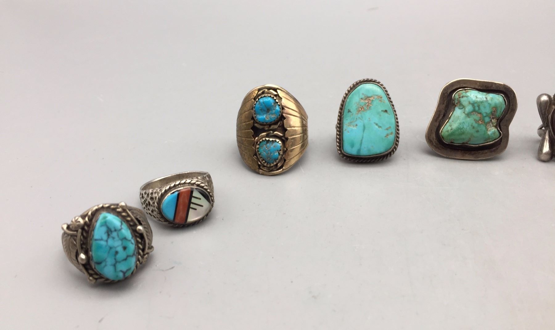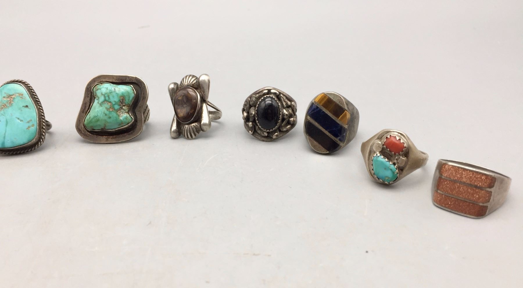 Description: Group of 10 vintage rings in various styles and sizes. All are sterling. Maker: Varies, mostly Navajo style. Approx. Age: Varies, mostly vintage. Size: Varies. Condition: Good for its age, normal wear expected. Please look closely at the pictures - they are an important part of our description. Shipping: There will be a $5 handling / packaging fee for shipping this lot. The actual cost of postage will be added on top of that.