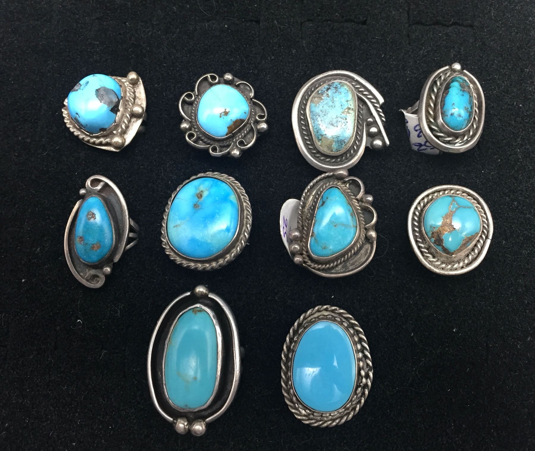 Description: Presented for sale in this lot we have a group of 10 vintage turquoise rings in various shapes and styles. They are set with varying shades of turquoise in sterling silver. Maker: Various. Approx. Age: Vintage. Size: Various. Combined weight is 80.4 grams. Condition: Good for their ages, normal wear expected. Please look closely at the pictures - they are an important part of our description. Shipping: There will be a $5 handling / packaging fee for shipping this lot. The actual cost of postage will be added on top of that.