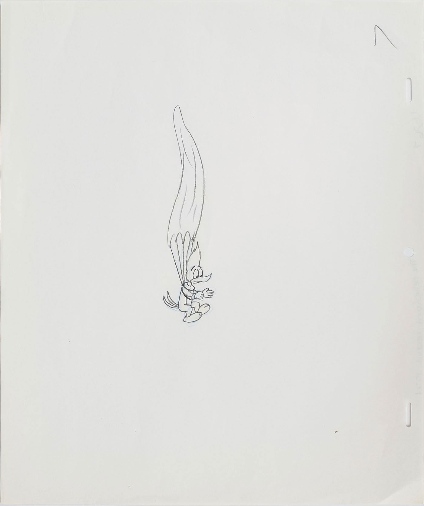 (Walter Lantz Productions, 1971–1972) Group of ten original production drawings of Woody Woodpecker, all showing the iconic character in a choice pose, most with marked with colors to be used. All are accomplished in graphite and colored pencil on untrimmed 12.5 x 10.5 sheets of animation paper. Character images range in size from 2.25 x 2.25 to 4.5 x 2.75. Each cartoon is identified in pencil on the reverse, including 'Gold Diggin' Woodpecker,' 'Kitty from the City,' 'The Reluctant Recruit,' and 'Woody's Magic Touch.' Also includes a twice-signed Walter Lantz Productions payroll check, February 26, 1972, payable to Lantz for $460, signed at the conclusion and endorsed on the reverse, "Walter Lantz." In overall fine condition.