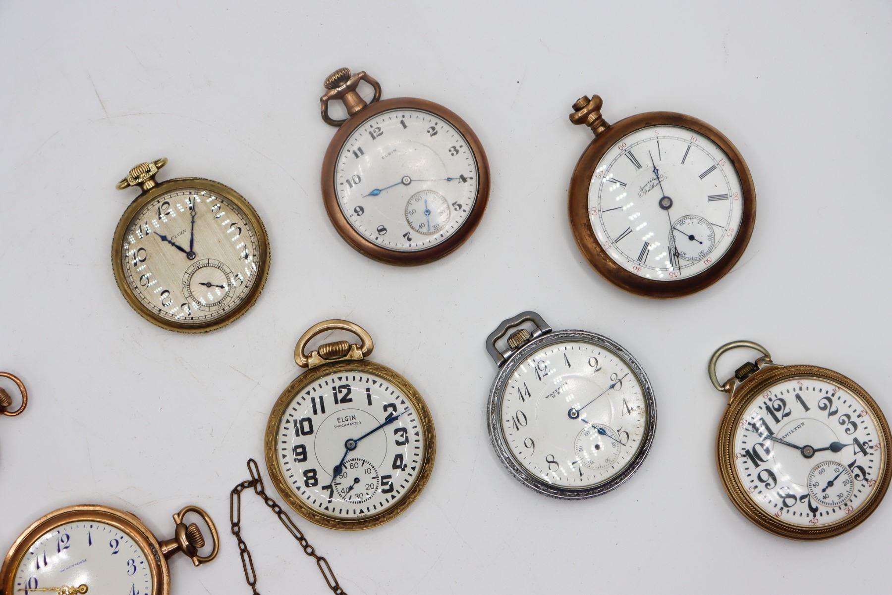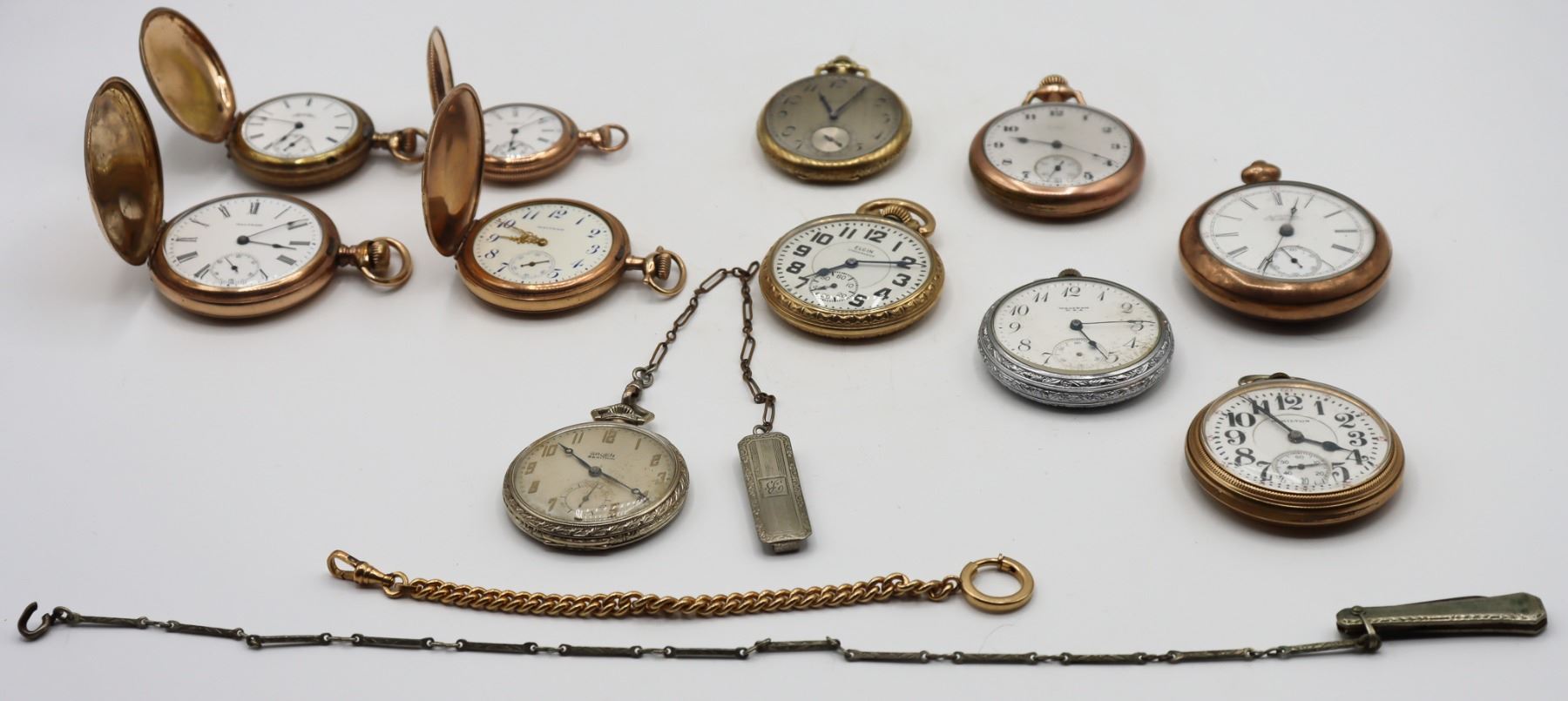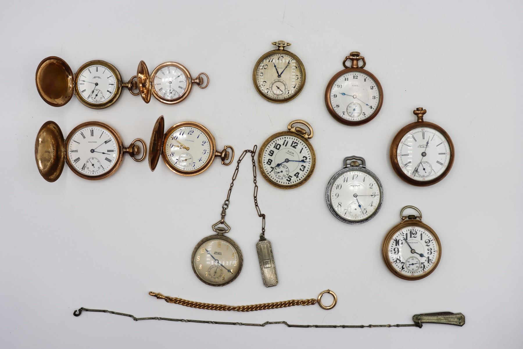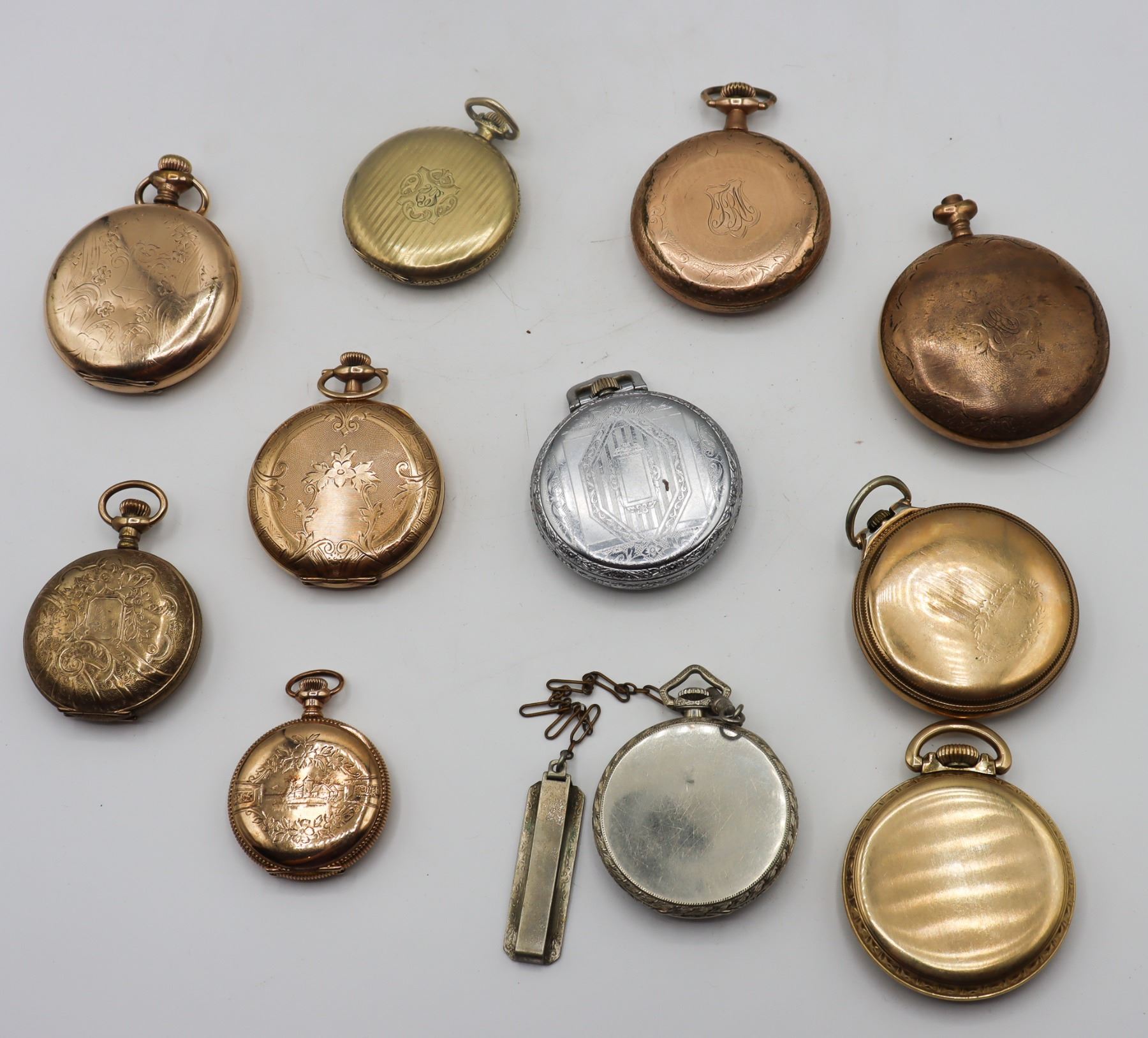 Group of eleven pocket watches of various makers and materials. Approximate average diameter: 2 1/2 in.