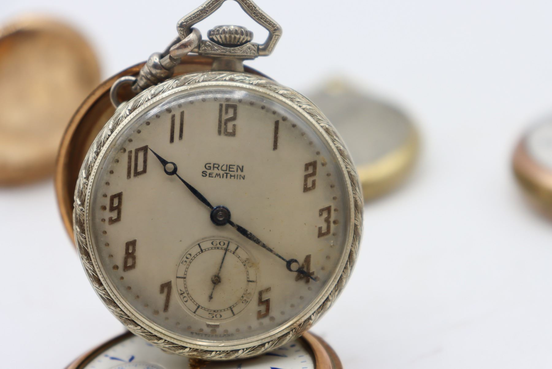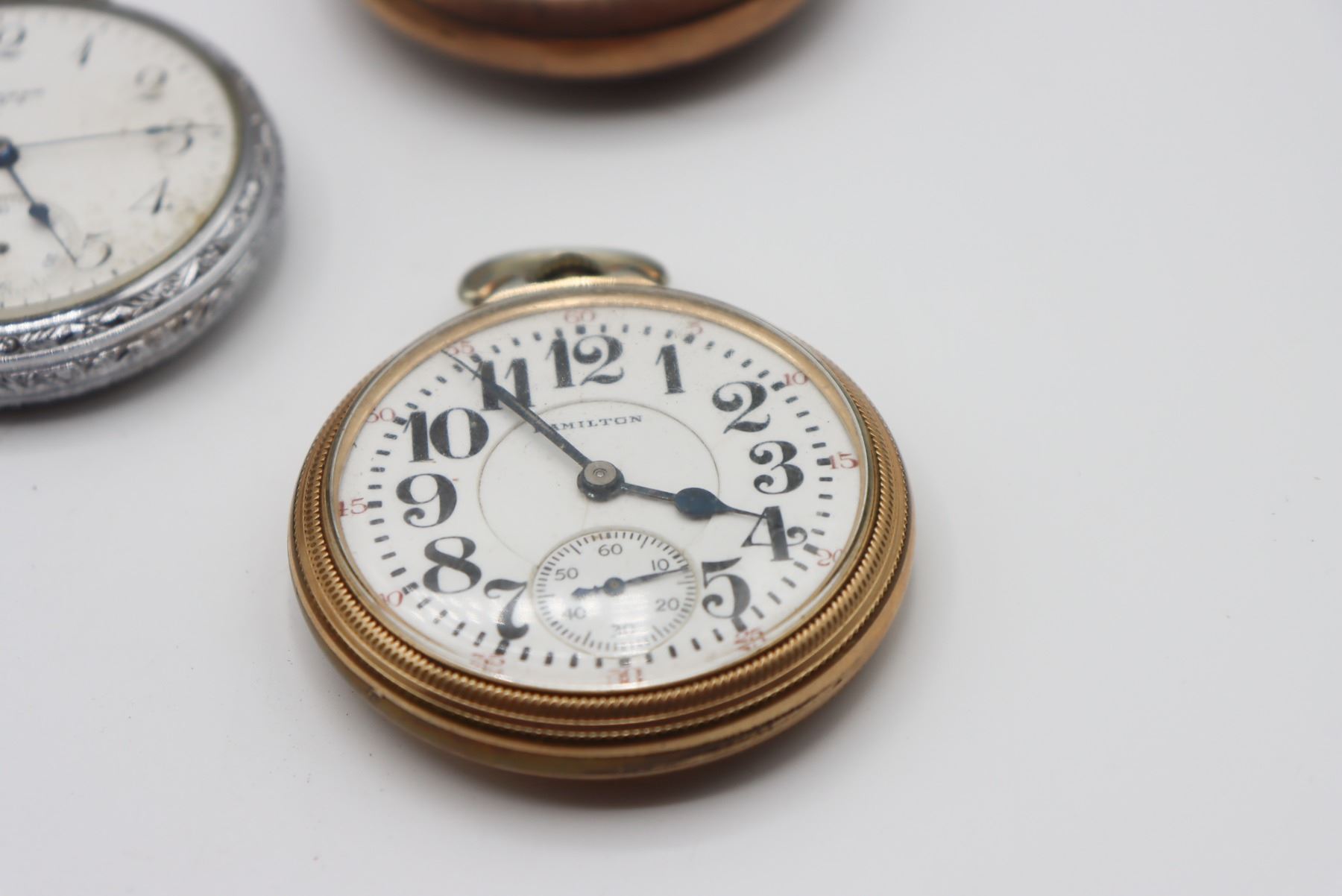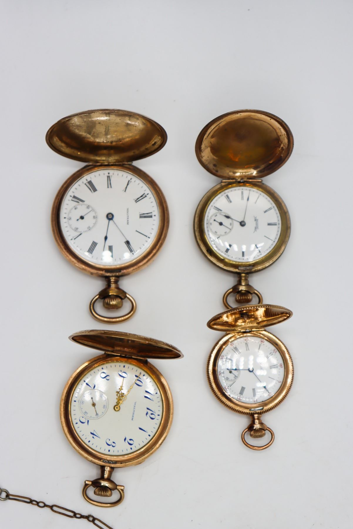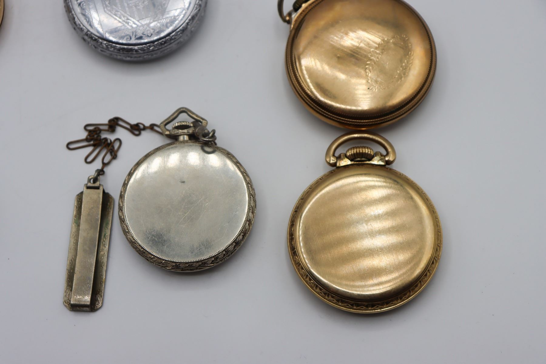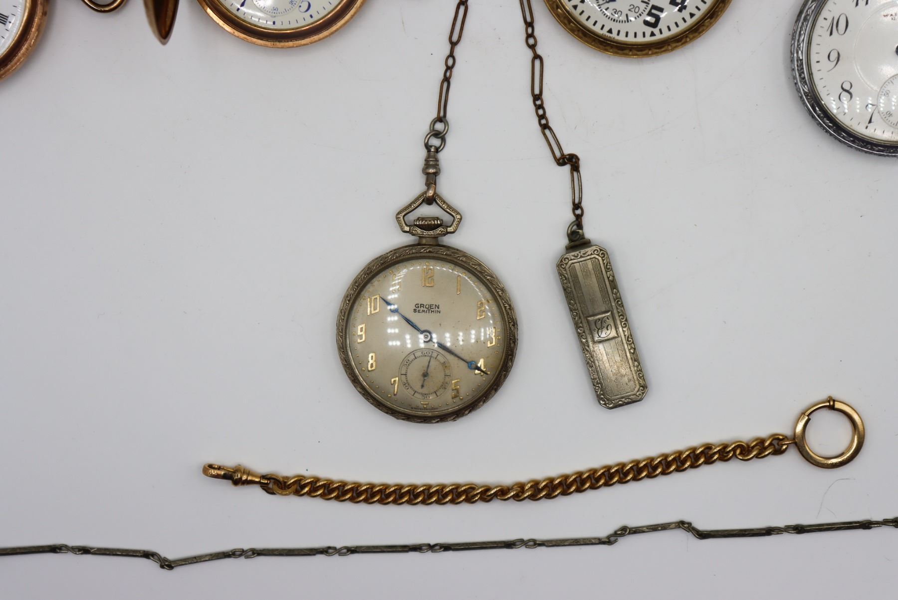 Group of eleven pocket watches of various makers and materials. Approximate average diameter: 2 1/2 in.