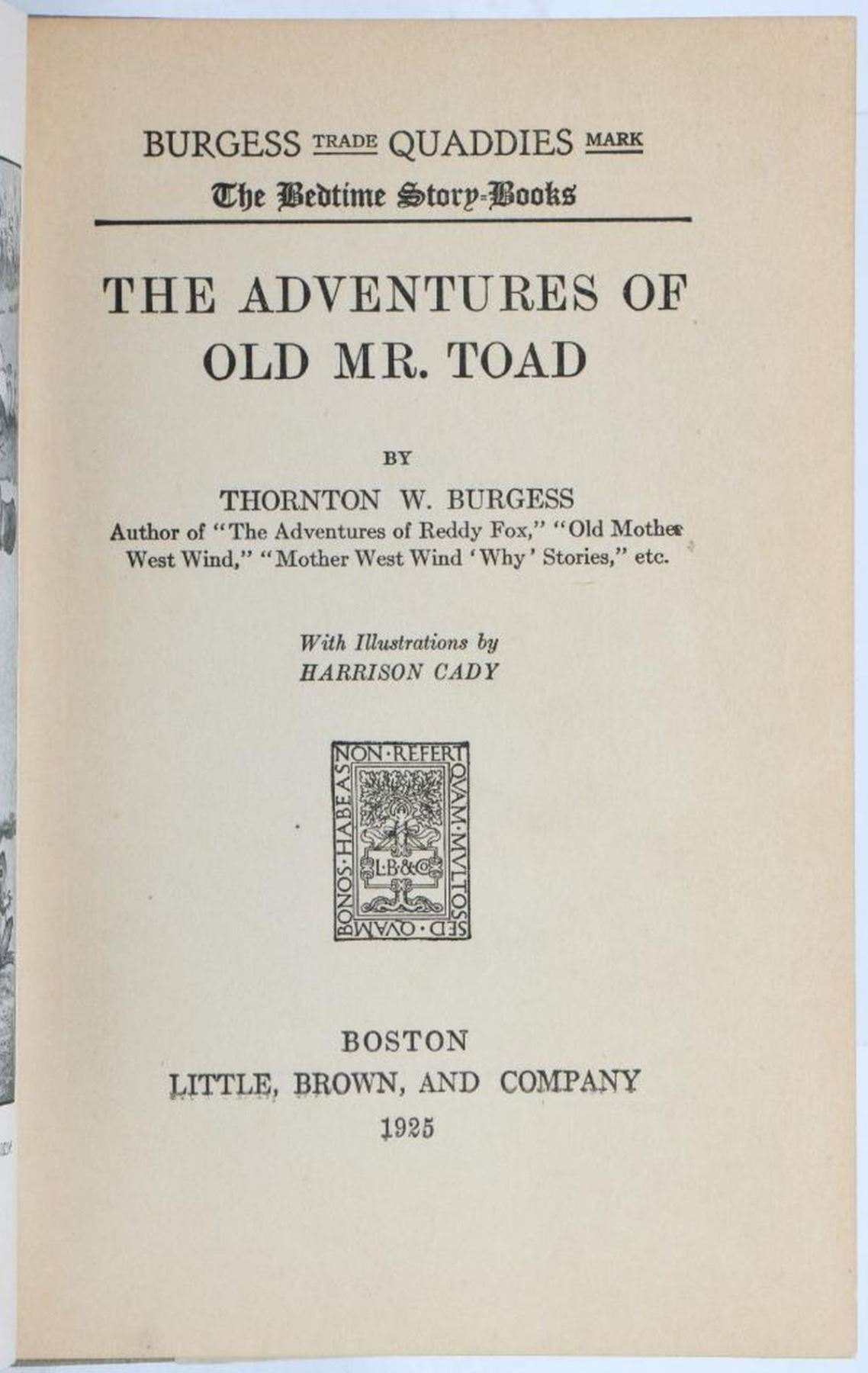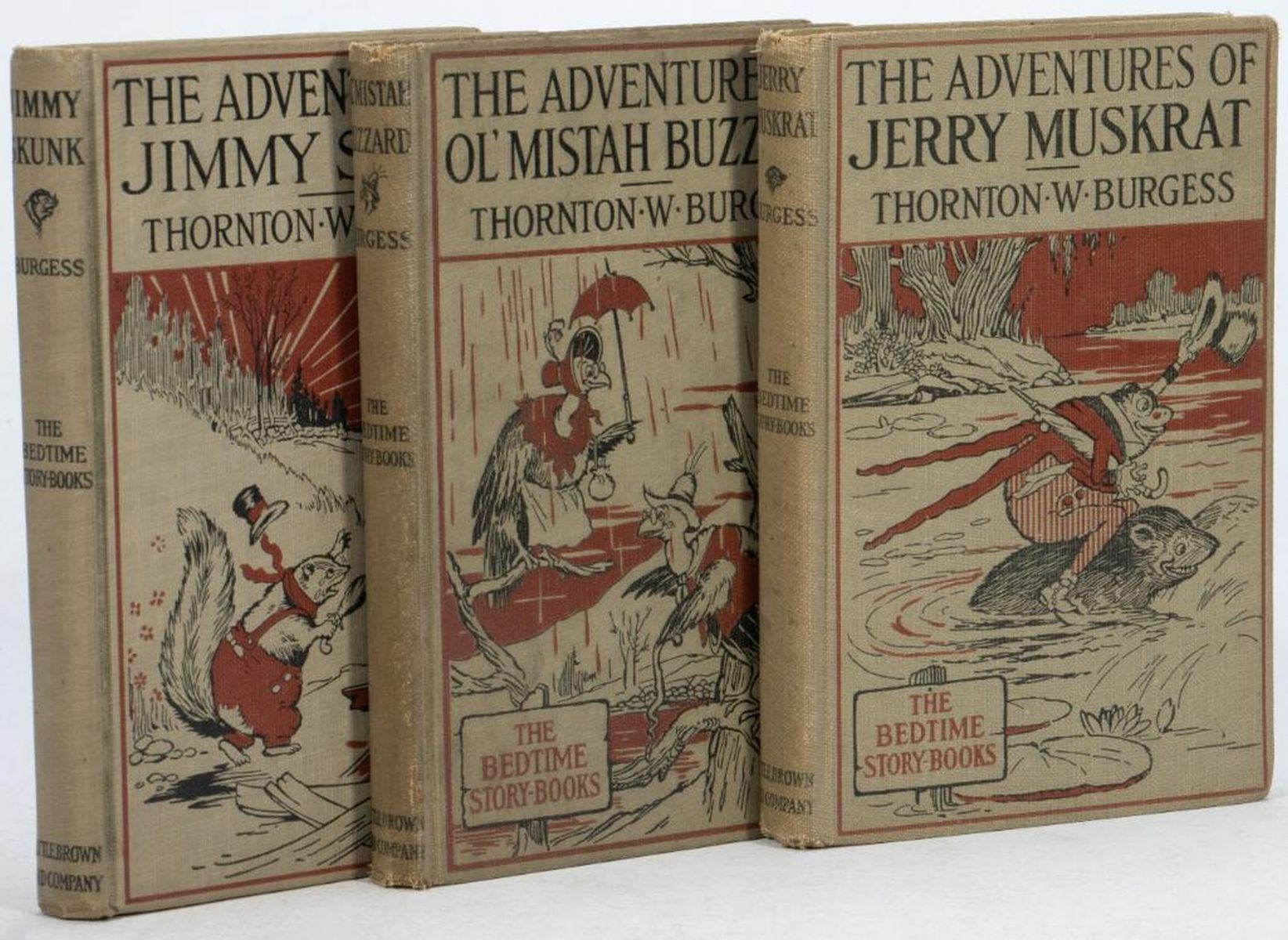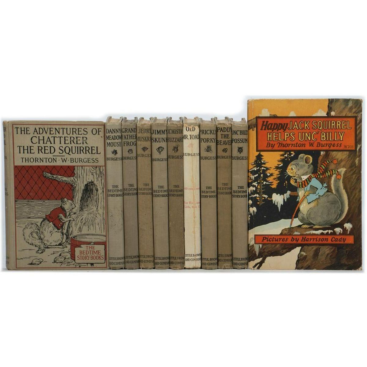 BURGESS, THORNTON W. Group of eleven Bedtime Story Books, Boston, Little, Brown and Company, 1919-1929: The Adventures of Chatterer the Red Squirrel; Danny Meadow Mouse; Grandfather Fog; Jerry Muskrat; Jimmy Skunk; Ol' Mister Buzzard; Old Mr. Toad; Prickly Porky; Paddy the Beaver; Unc' Billy Possum; with Happy Jack Squirrel Helps Unc' Billy, 1927. All in generally good condition; wear/soiling, inscriptions, etc.