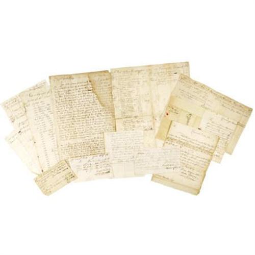 <B>Grouping of Twelve Late 18th Century American Business Documents,</B></I> included are the following:<BR>Listing of "<I>ruffled shirts</B></I>" sold to merchant William Wilson of Alexandria, Virginia, one page, 6.5" x 8.25", September 10, 1784. Split along one fold, else fine condition.<BR>Two invoices to William Wilson for various fabric goods, three pages, 89" x13", 1784 and 1785, stains, folds. Very good condition.<BR>ALS, "<I>G. Salmon</B></I>", four pages, 9.25" x 14.5", London, May 7, 1784 and May 12, 1784, to Captain Thomas Pamp and George Moore, n.p. Instructions for a commercial voyage to Maryland's Patuxent River are related here in minute detail. Large water stain, else very good condition.<BR>Two receipts on one sheet made out to Andrew Buchanan, signed by James Alcock and Charles Wells, two pages, 6.25" x 3.75", Baltimore, April 18, 1786 and London, June 1, 1786. Marginal splits, very good condition.<BR>ANS, "<I>Joseph Woodbridge</B></I>", one page with docketing, 6.5" x 4.25", September 19, 1787, Groton, Connecticut, to Captain Daniel Packer. Orders to deliver lumber. Light stains, fine condition.<BR>Partly-printed DS, "<I>J. Osgood</B></I>" and "<I>William Morgand</B></I>", two pages, 7.5" x 6.25", Salem, Massachusetts, January 8, 1793 and March 18, 1793. A call for citizens to sit on a Grand Jury. Fine condition.<BR>Itemized invoice, one page, 12.25" x 15.5", Norwich, Connecticut, October 31, 1782. Listed are purchases made between 1780 and 1782 by Dr. Colonel Joshua Huntington. With some staining and uneven toning, otherwise good condition.<BR>ANS, "<I>Wm. Wilson</B></I>", one page, 7.5" x 4.5", Alexandria, Virginia, November 30, 1792. Instruction to settle an account in sixty days. Fine condition.<BR>ALS, "<I>Samuel Hobbs</B></I>", one page, 5.75" x 7.25", Cambridge, Massachusetts, February 24, 1788, to Colonel Josiah Little, Newburyport. A very polite request for payment of monies owed. Some stains, very good condition.<BR>Invoice, 13" x 8", Philadelphia, December 13, 1796. Revisions to an account between John D. Blanchard and George Meade. Fine condition.<BR>ALS, "<I>Walter Wimple</B></I>", one page, 8" x 10", Claverack, New York, May 1, 1789, to State Treasurer Gerard Bankes, New York. Advises of funds being sent by courier. Lovely red wax seal with WW monogram. Fine condition. <I>From the collection of Henry E. Luhrs.</B></I><BR><BR><b>Shipping:</b> Flat Material, Small (<a target="_blank" href="http://www.heritageauctions.com/common/shipping.php">view shipping information</a>)