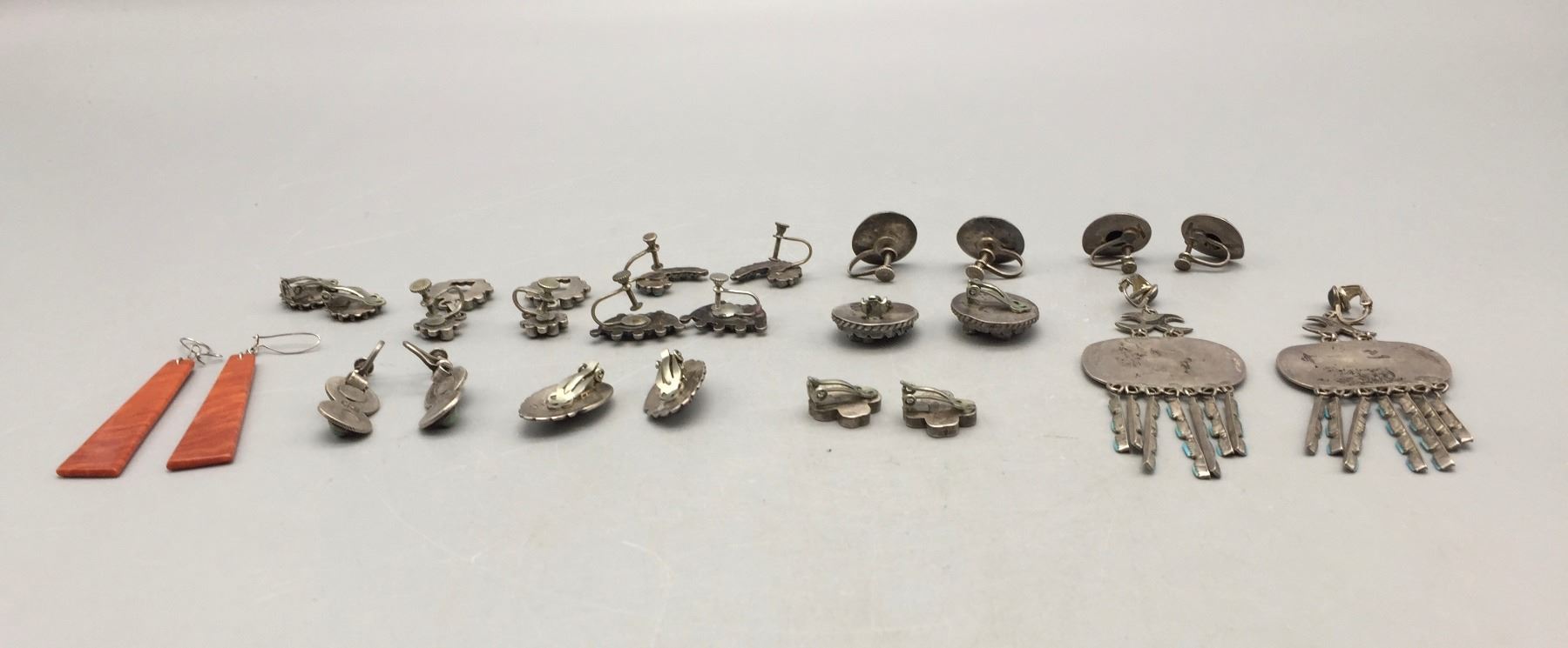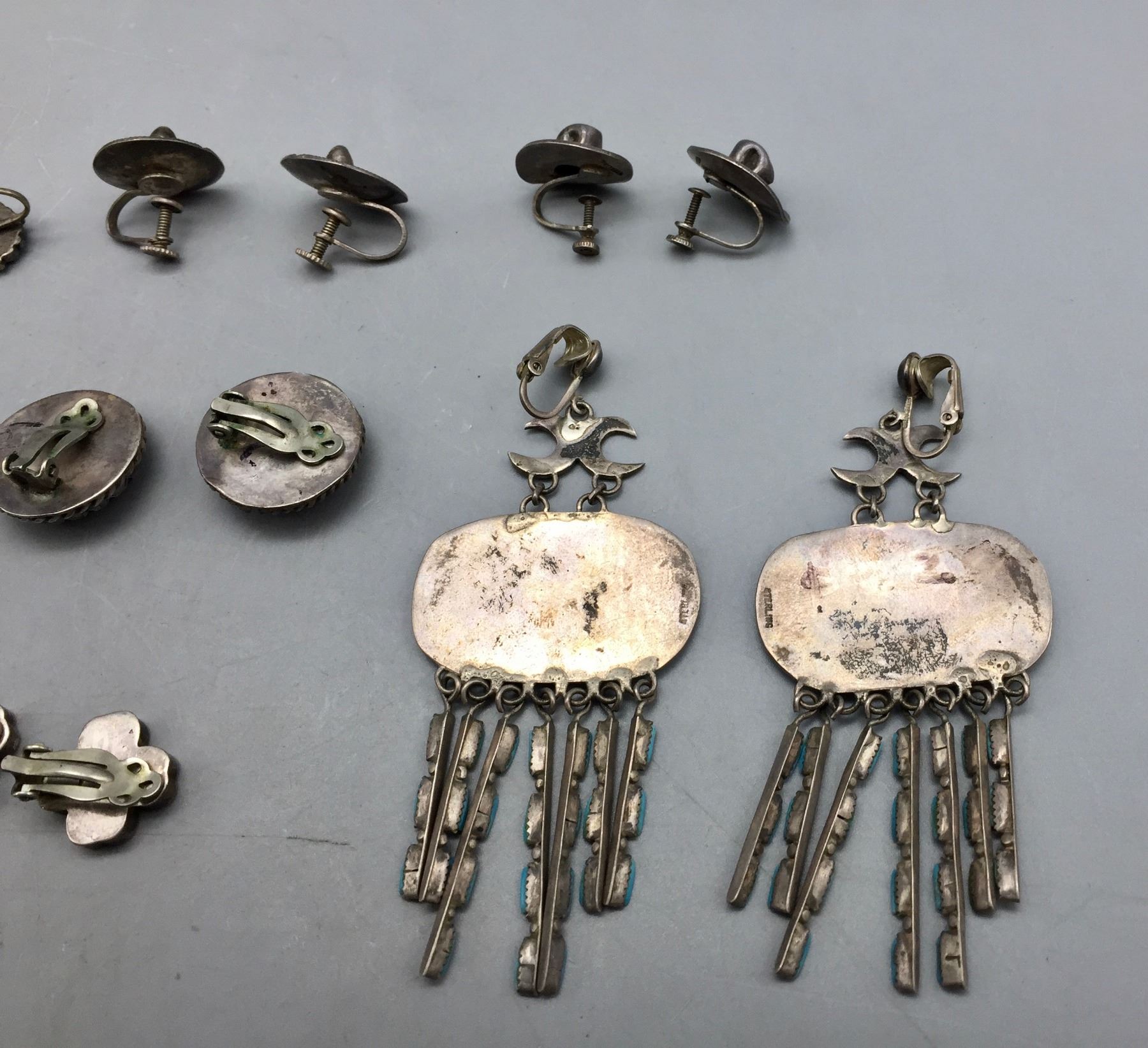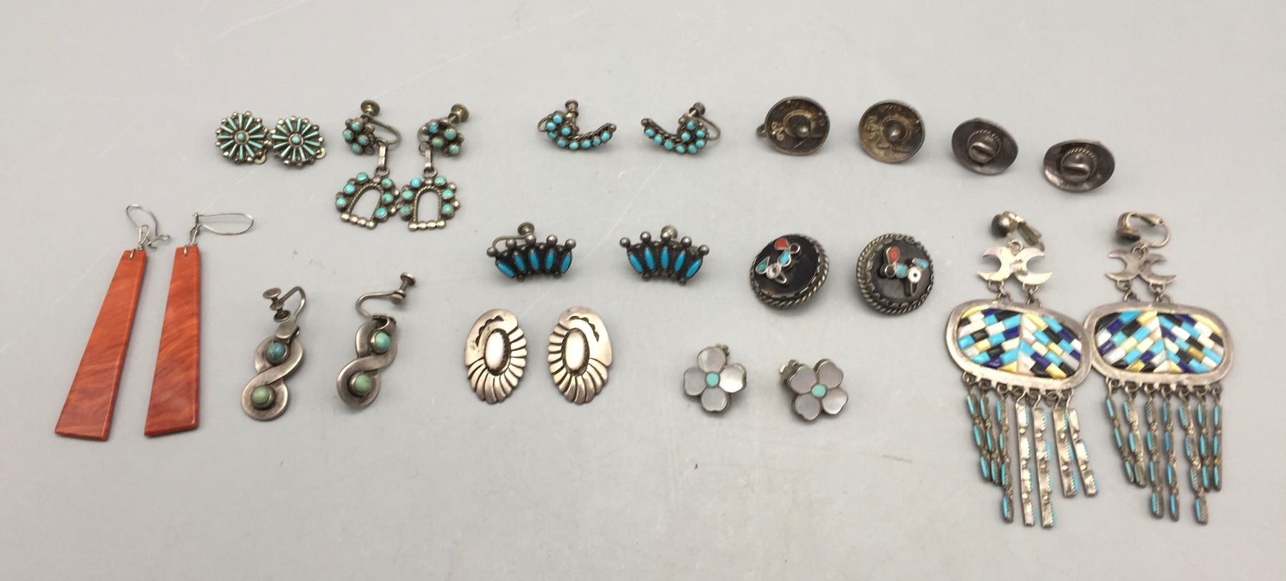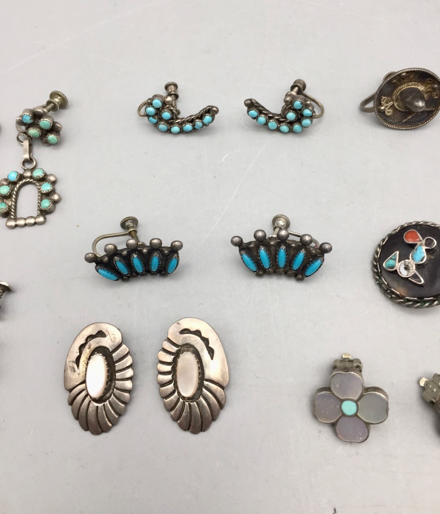 Description: Presented for sale in this lot is a group of 12 pair of earrings. Some feature turquoise and they are various styles. Take a look! Appear to be sterling silver where applicable. Maker: Various. Approx. Age: Vintage and modern. Size: Varies. Combined weight of 91.6 grams. Condition: Good for their age, normal wear expected. Please look closely at the pictures - they are an important part of our description. Shipping: There will be a $5 handling / packaging fee for shipping this lot. The actual cost of postage will be added on top of that.