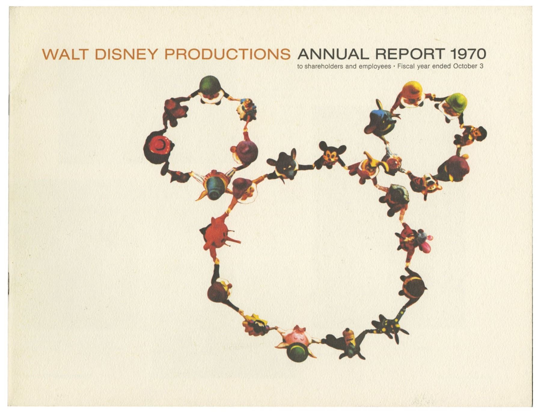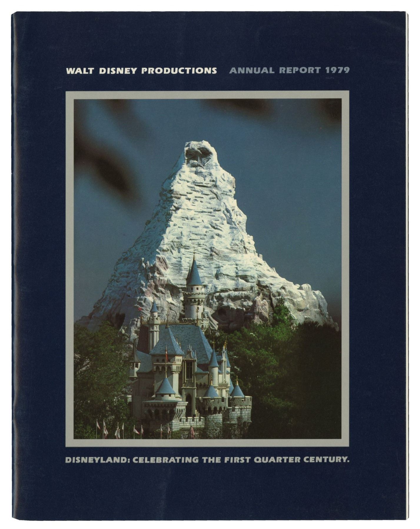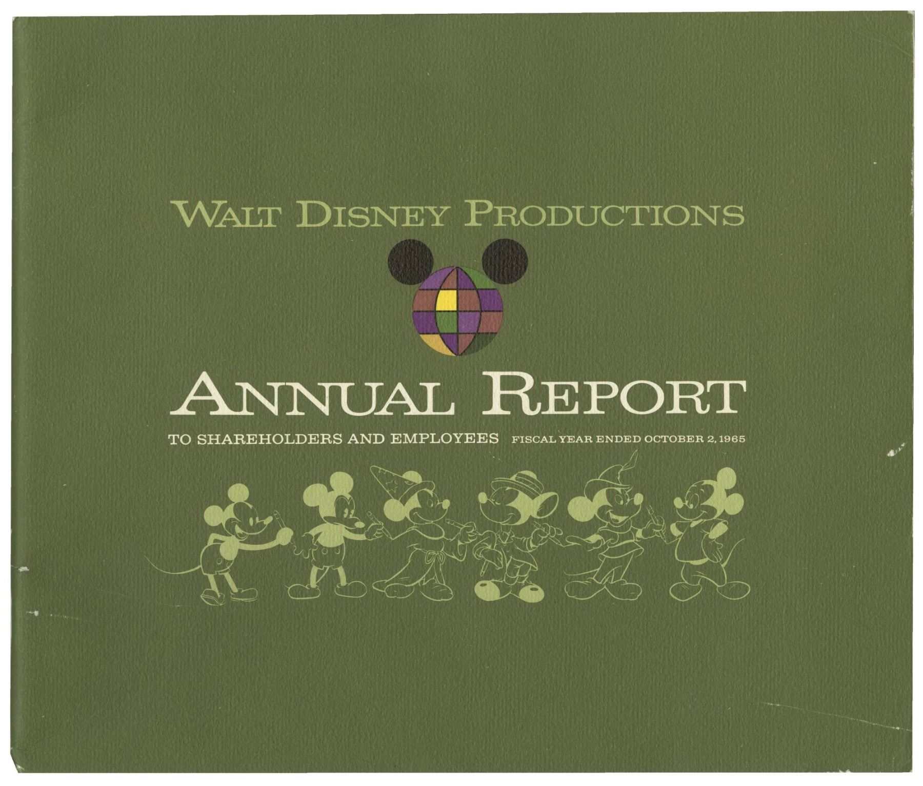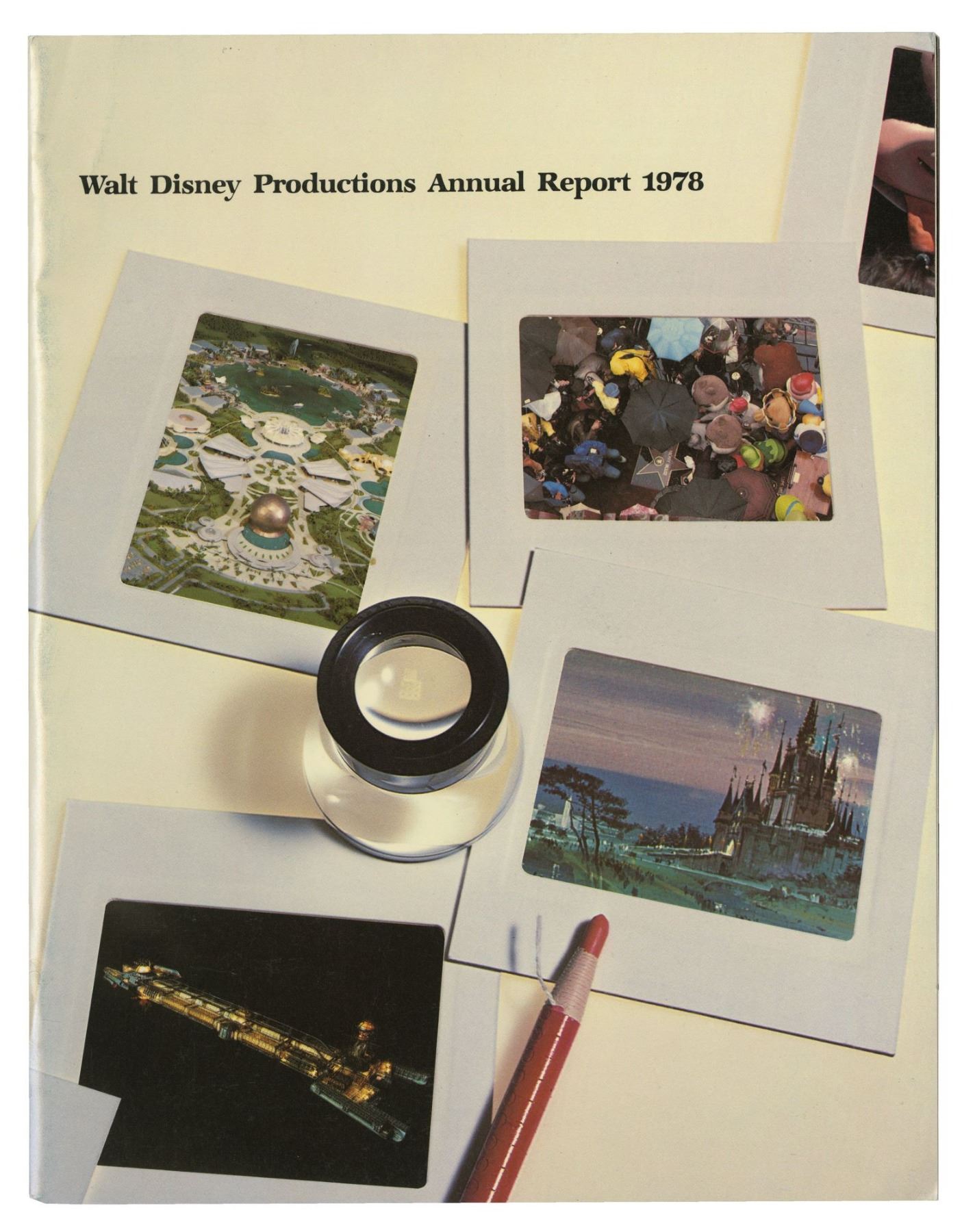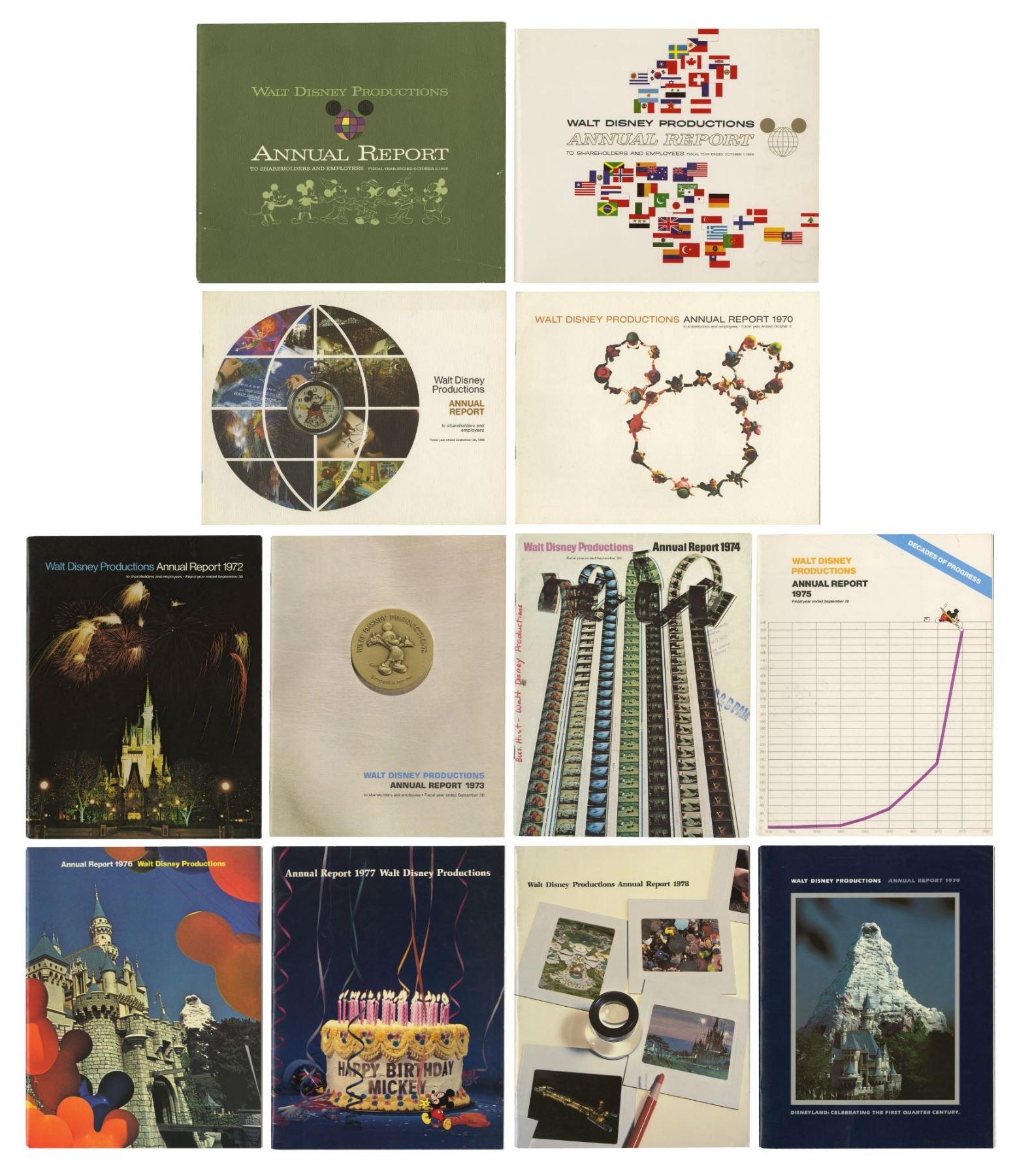 (Walt Disney Productions, 1965-79) A large collection of (12) annual reports for Walt Disney Productions for the years 1965, 1966, 1968, 1970, and 1972-1979. These reports were given to shareholders in the company, and highlight the projects from that year as well as upcoming projects in animation, live action, and theme park development. This impressive collection shows the progress of the company over the years, from Walt Disney's final full year at the company, to his passing in 1966, to how the company progressed after he was gone. The reports measure approximately 11"x8.5" each, and the set is in good condition overall, with general wear throughout from use. The 1974 report has some writing on the cover.