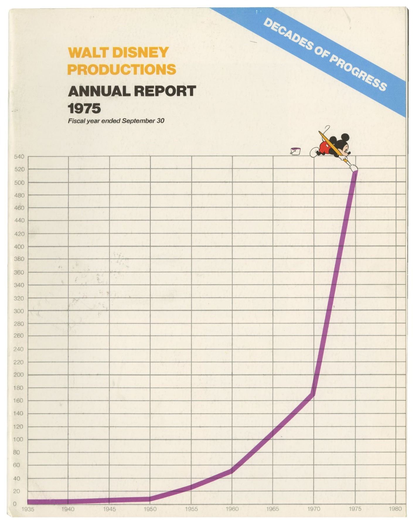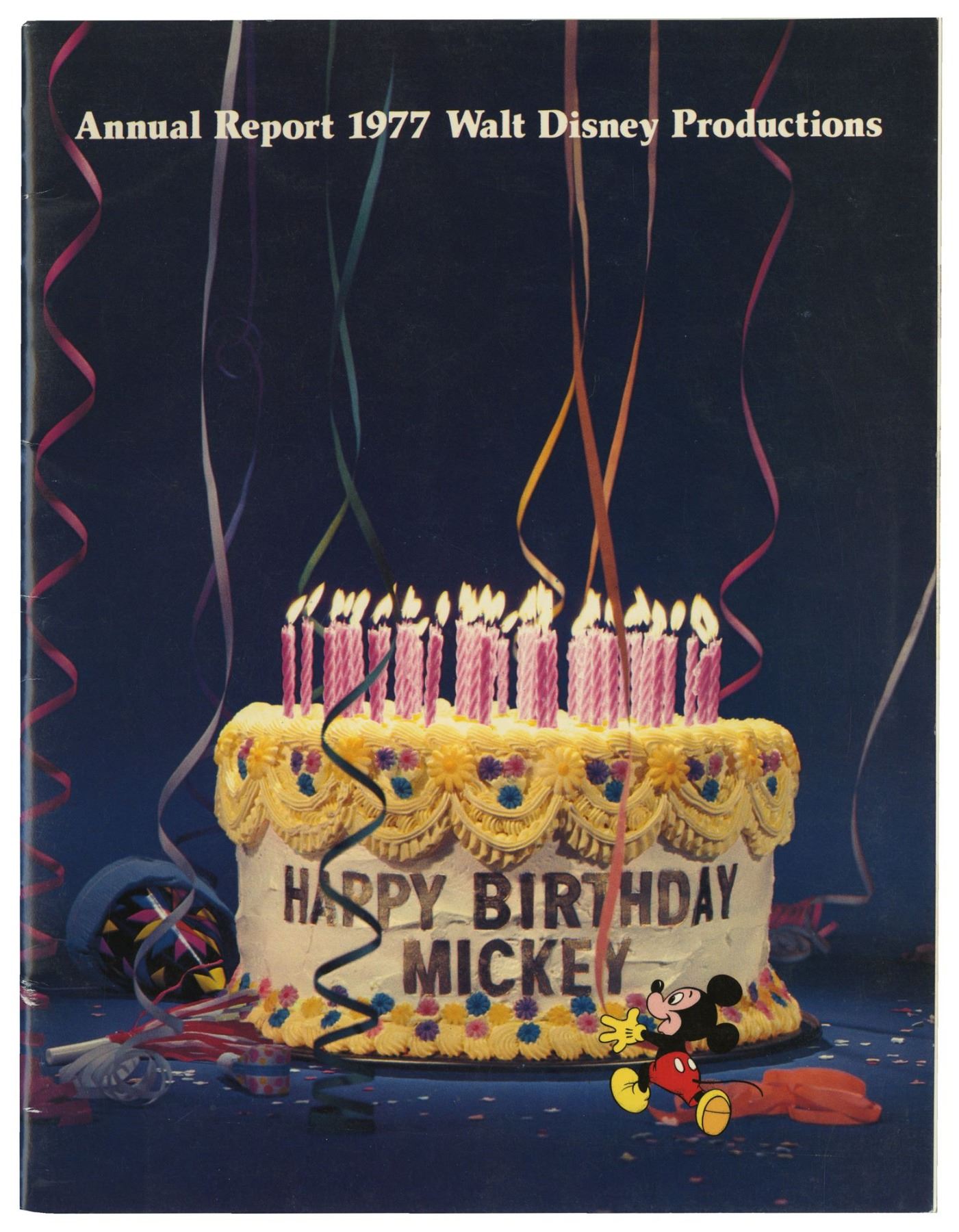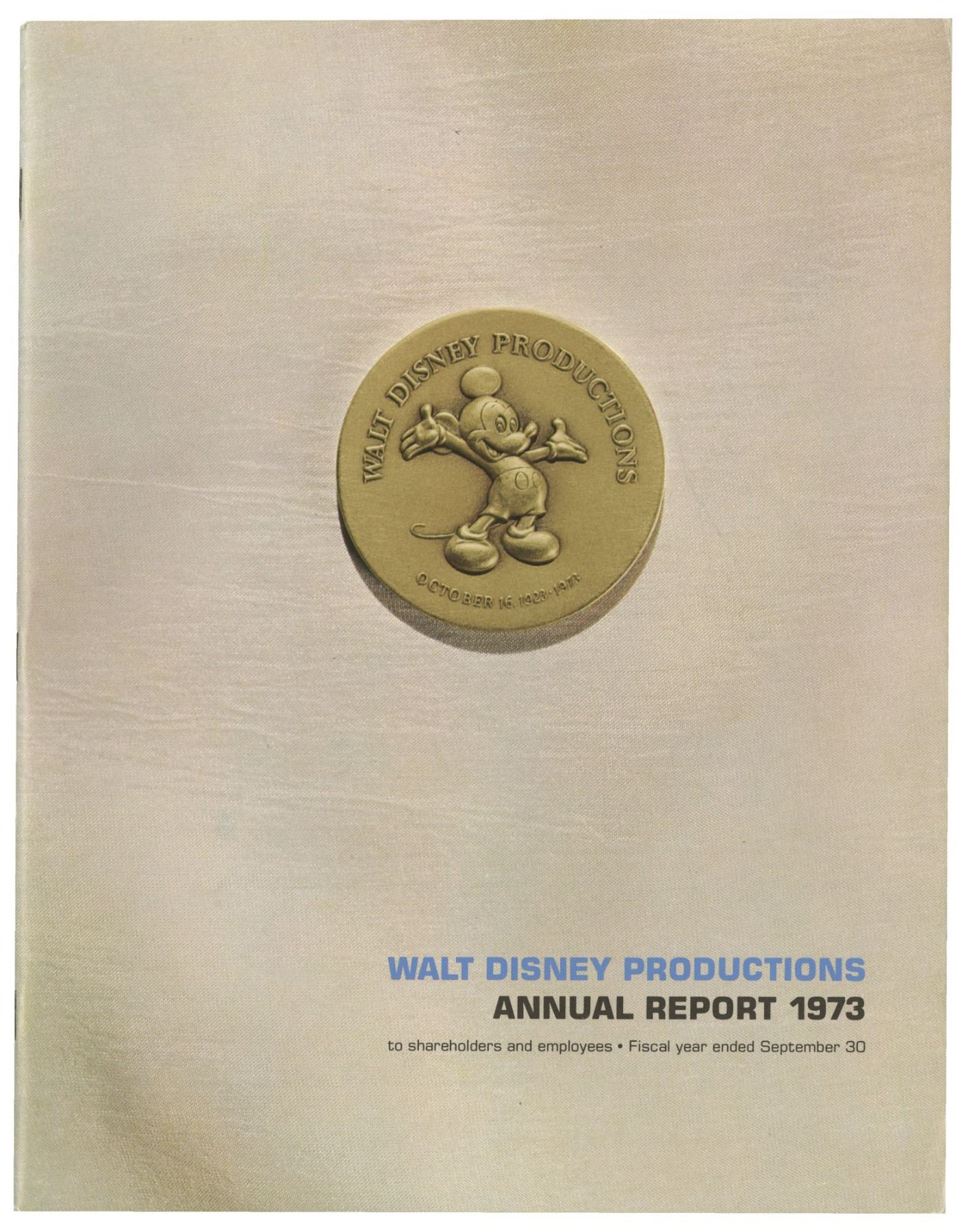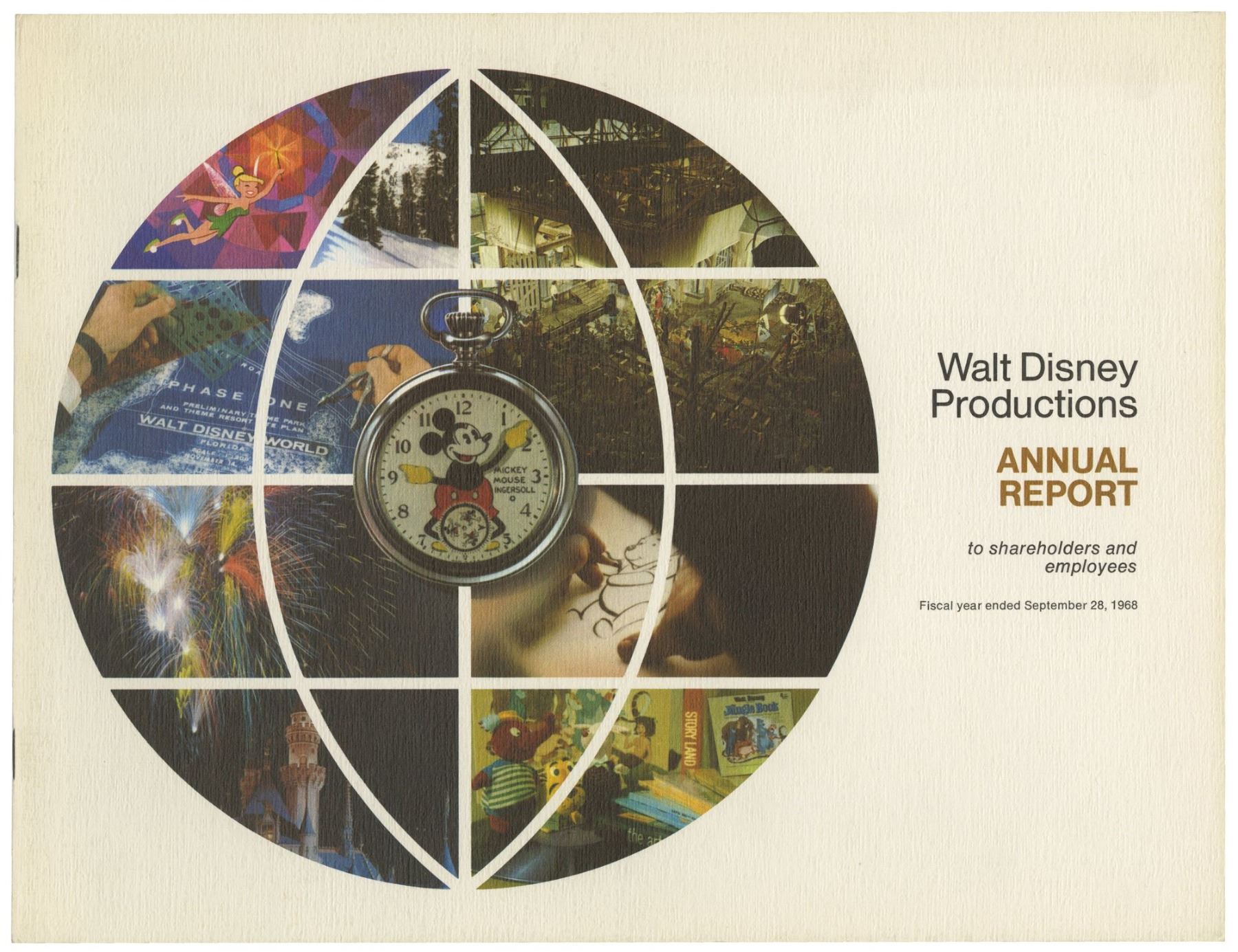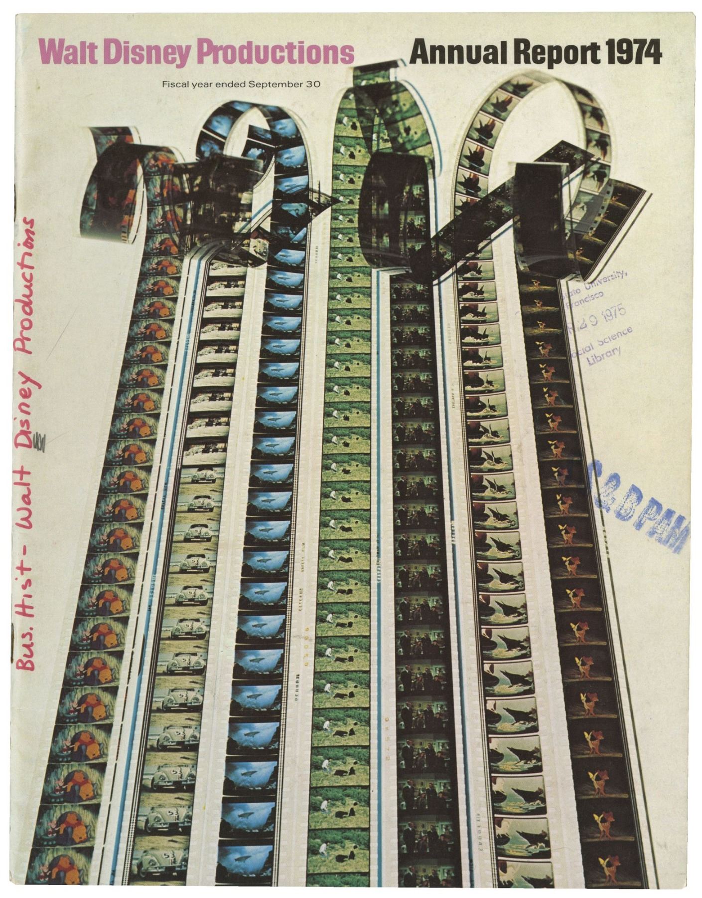 (Walt Disney Productions, 1965-79) A large collection of (12) annual reports for Walt Disney Productions for the years 1965, 1966, 1968, 1970, and 1972-1979. These reports were given to shareholders in the company, and highlight the projects from that year as well as upcoming projects in animation, live action, and theme park development. This impressive collection shows the progress of the company over the years, from Walt Disney's final full year at the company, to his passing in 1966, to how the company progressed after he was gone. The reports measure approximately 11"x8.5" each, and the set is in good condition overall, with general wear throughout from use. The 1974 report has some writing on the cover.