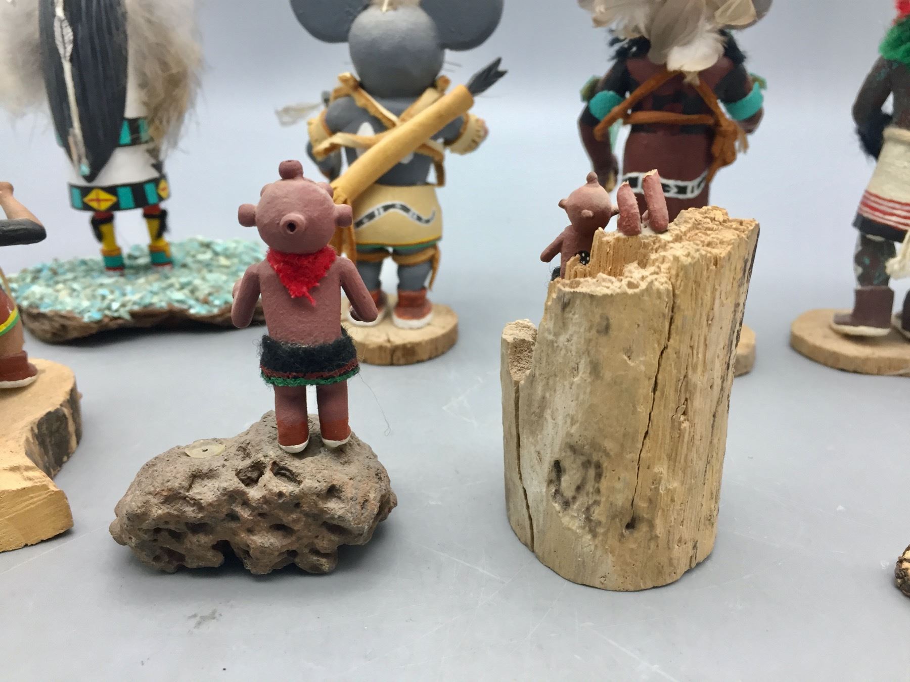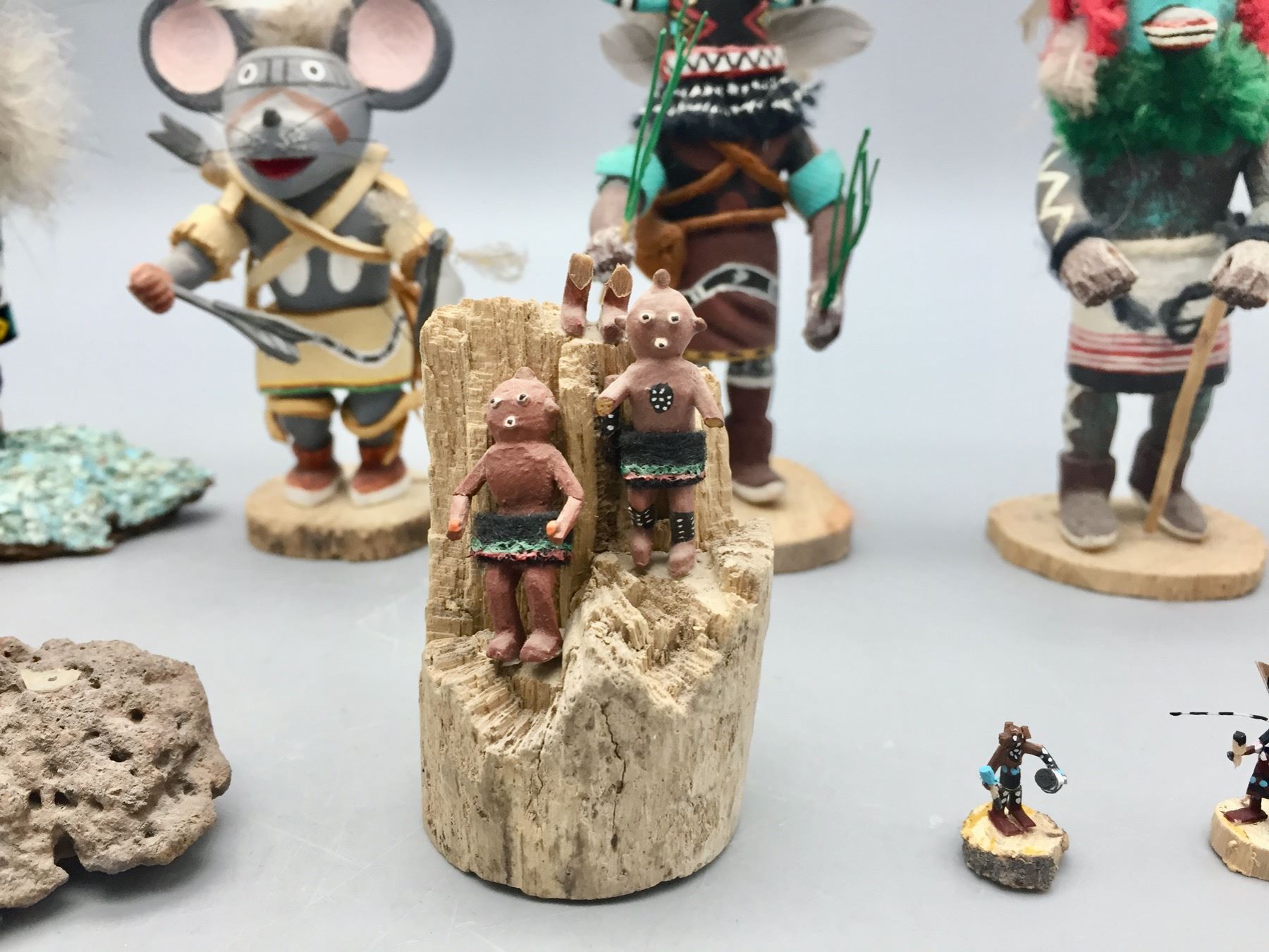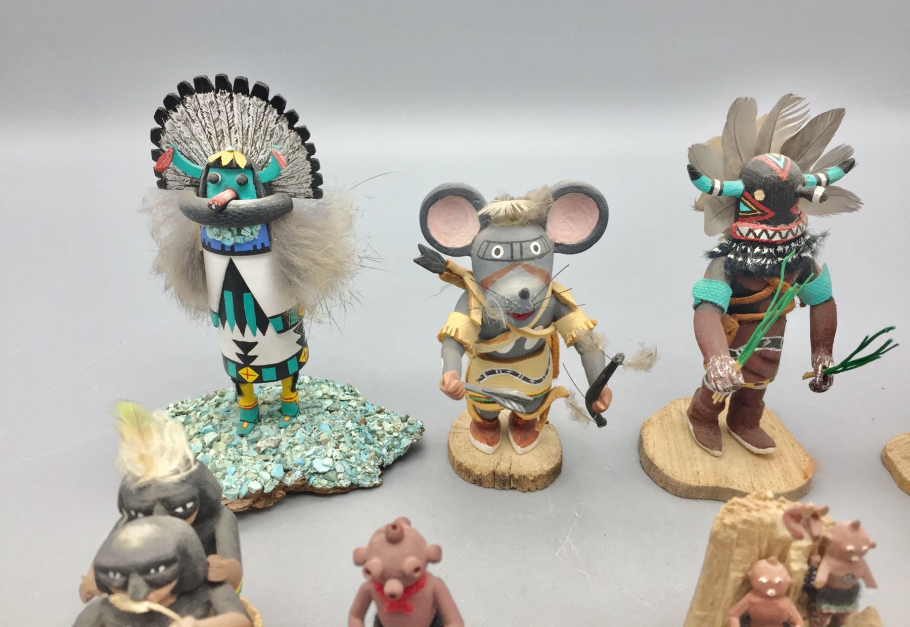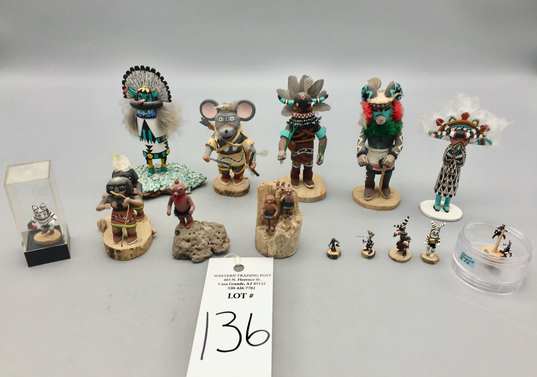 Description: For sale in this lot is a group of 14 miniature handmade Kachinas in a variety of sizes and styles. Maker: Various. Approx. Age: Vintage to modern. Size: Small. Condition: Pretty good for their ages, some wear and imperfections expected. Please look closely at the pictures - they are an important part of our description. Shipping: There will be a $15 handling, packaging fee for shipping this lot. The actual cost of postage will be added on top of that.