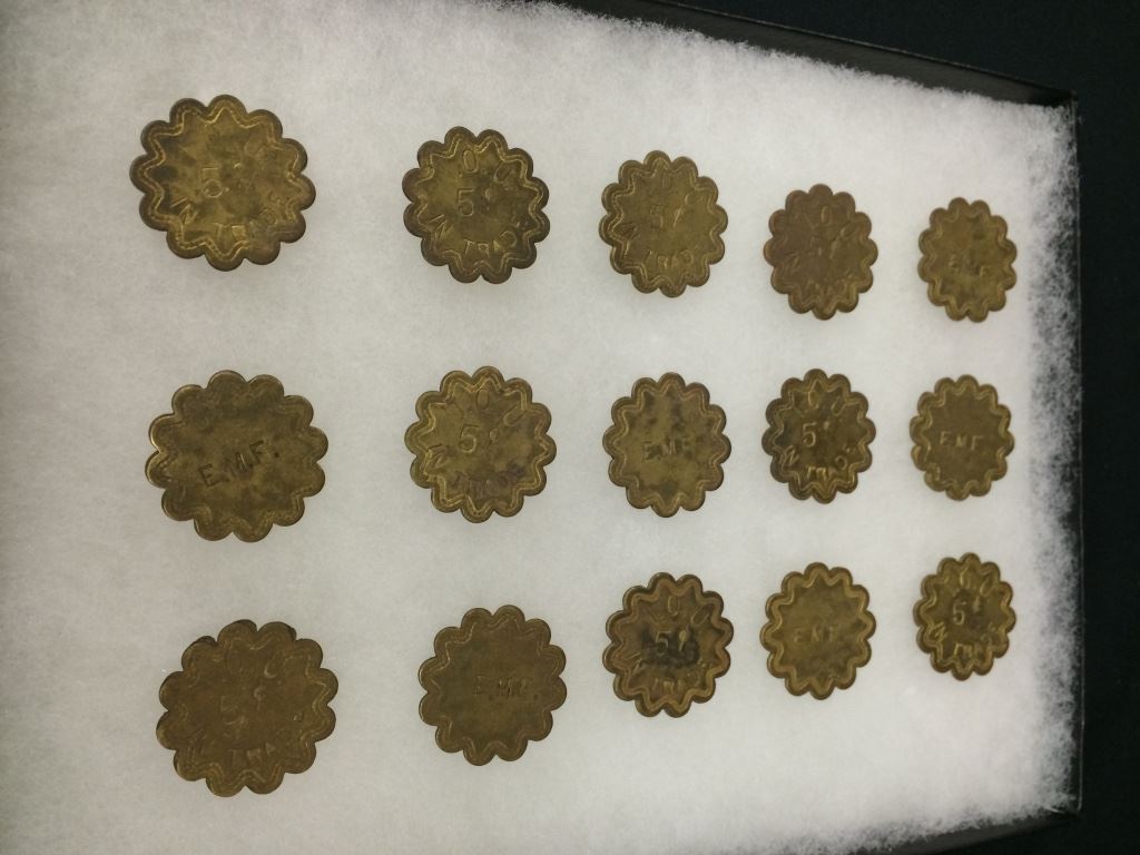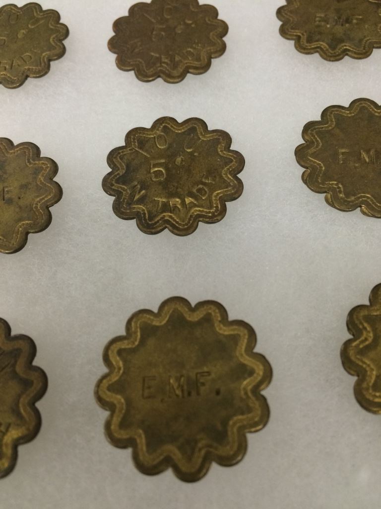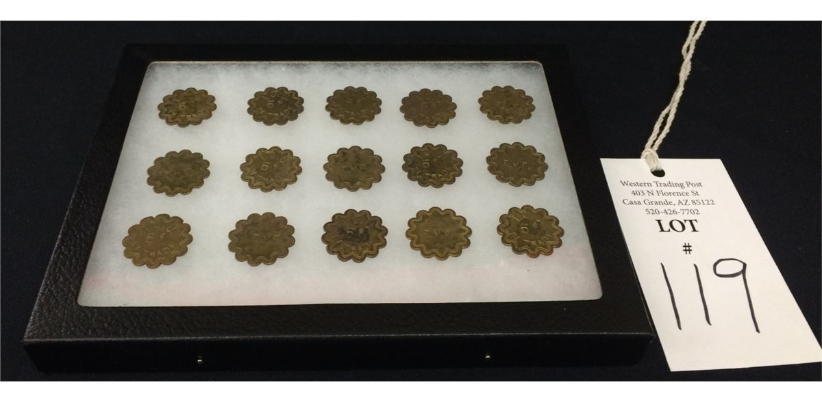 There are 15 vintage, brass trade tokens framed in a riker display. All tokens say I.O.U .05c in trade on one side and the initials E.M.F. (for the store?) on the other.