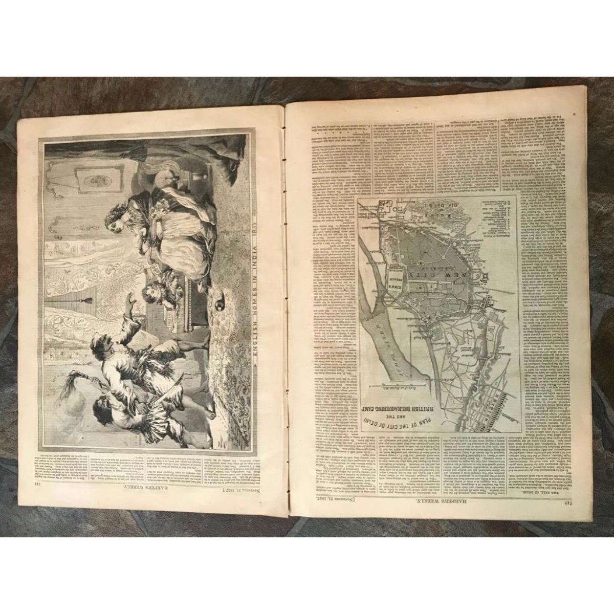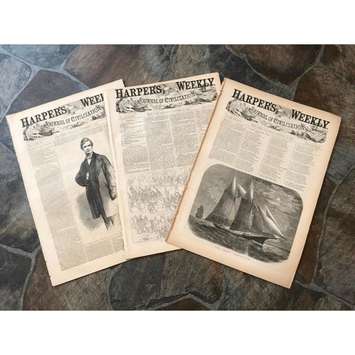 Group of 1850's Harper's Weekly Illustrated newspapers, dated 1857, 1858 & 1859. Articles on interests of the day, stories & back cover cartoons. A fantastic illustration of the US War Sloop Brooklyn, a railway train caught in a snowdrift, map of Delhi & a double-page engraving of a grand state procession at Delhi, also illustrations of the Winans Steamship.
