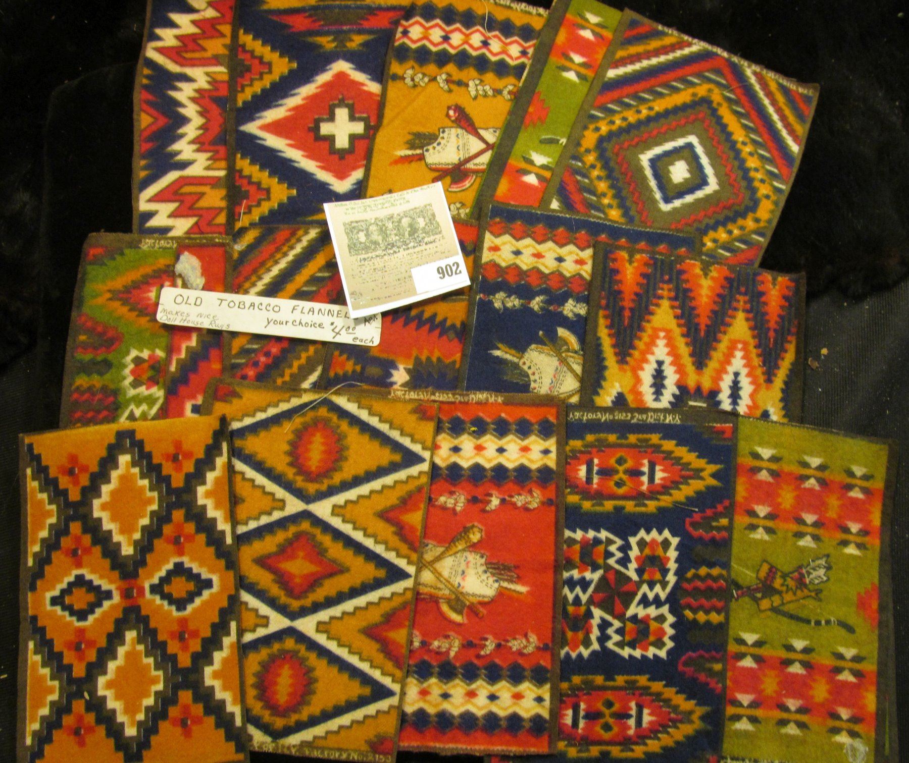 Group of (19) Old Tobacco Flannels with Indian Designs. Doc's note said they make good Doll House rugs.