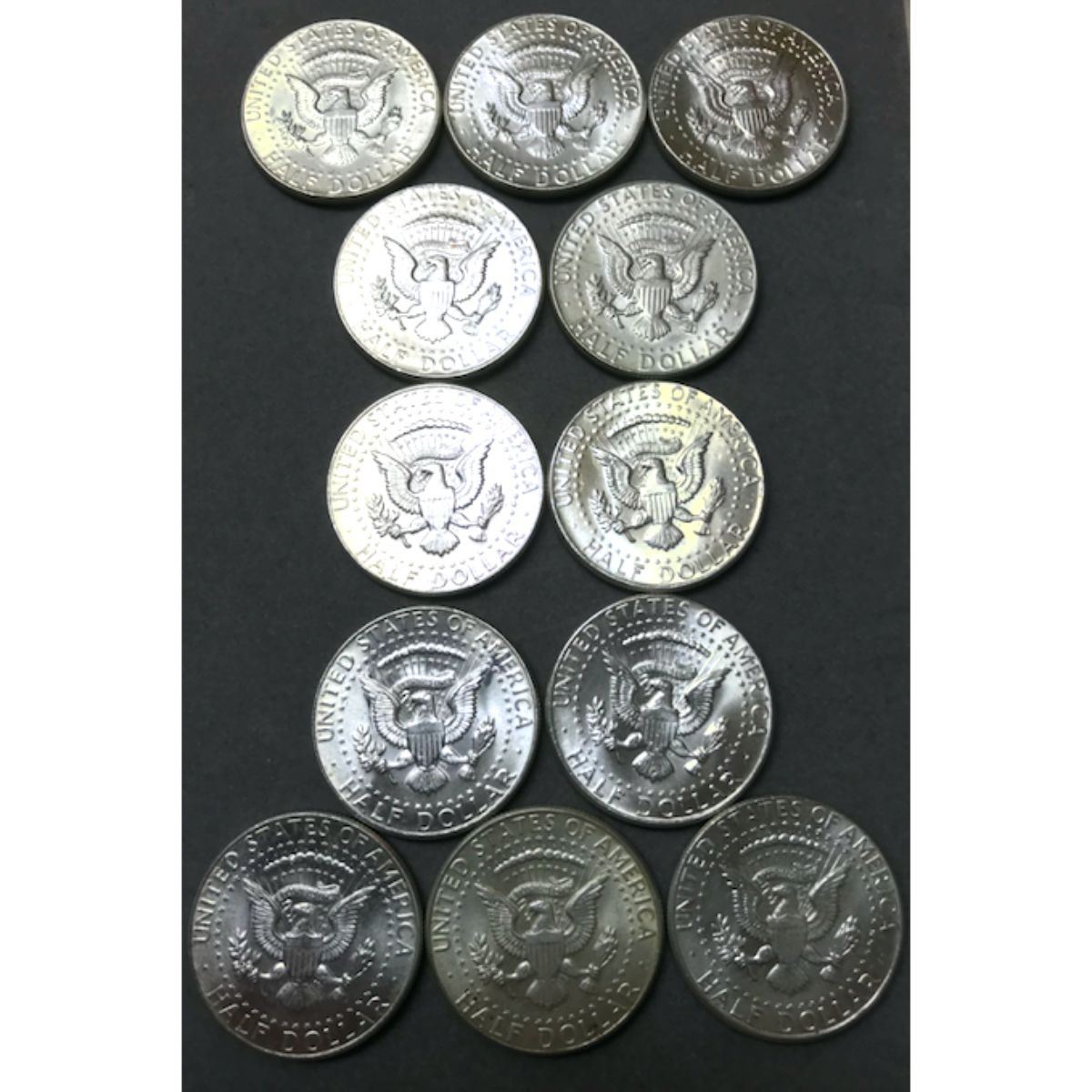 1964 partial $10 Halves bankroll of coins ( 12 total ) United States Kennedy half-dollars with bust of President John F. Kennedy on obverse, eagle on reverse, in pristine, mostly uncirculated condition. No mint marks. Stored in a safe in Mississippi for over 50 years. * only removed from role to photograph.