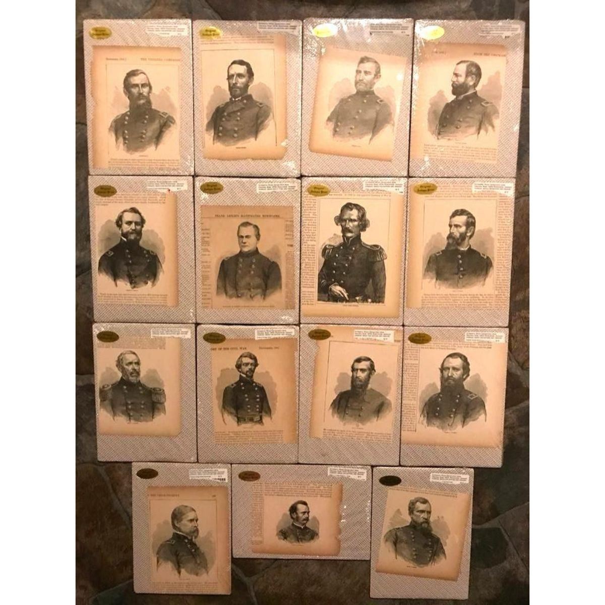 Group of 15 small wood engravings, clipped from various 1860's illustrated newspapers ( with surrounding boarders for framing ) featuring Civil War Union Generals. Approximate 5" X 5" image size shrink-wrapped on 7" X 9" cardboard sheets, originally packaged for The American Heritage Gallery in the early 1990's.Â