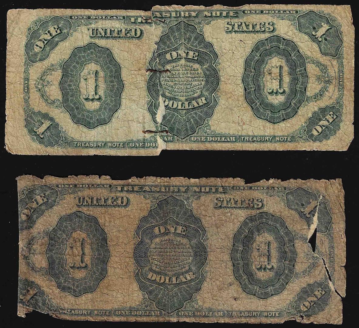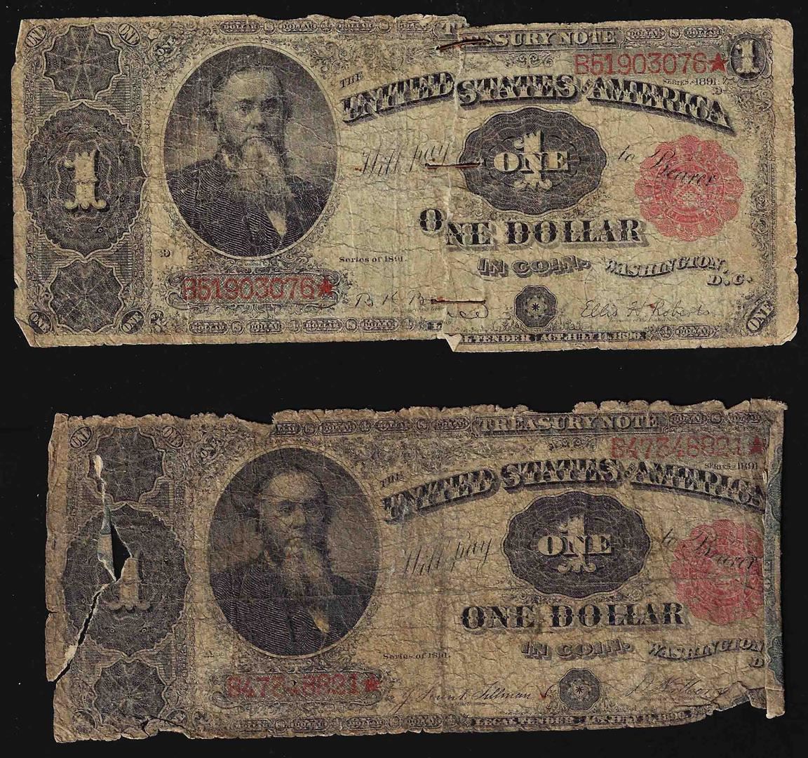 One Group of (2) 1891 $1 Treasury Notes. One Note has damage and has been repaired with three staples along the center line, the other note has a severe tear on the left side and other damage throughout.