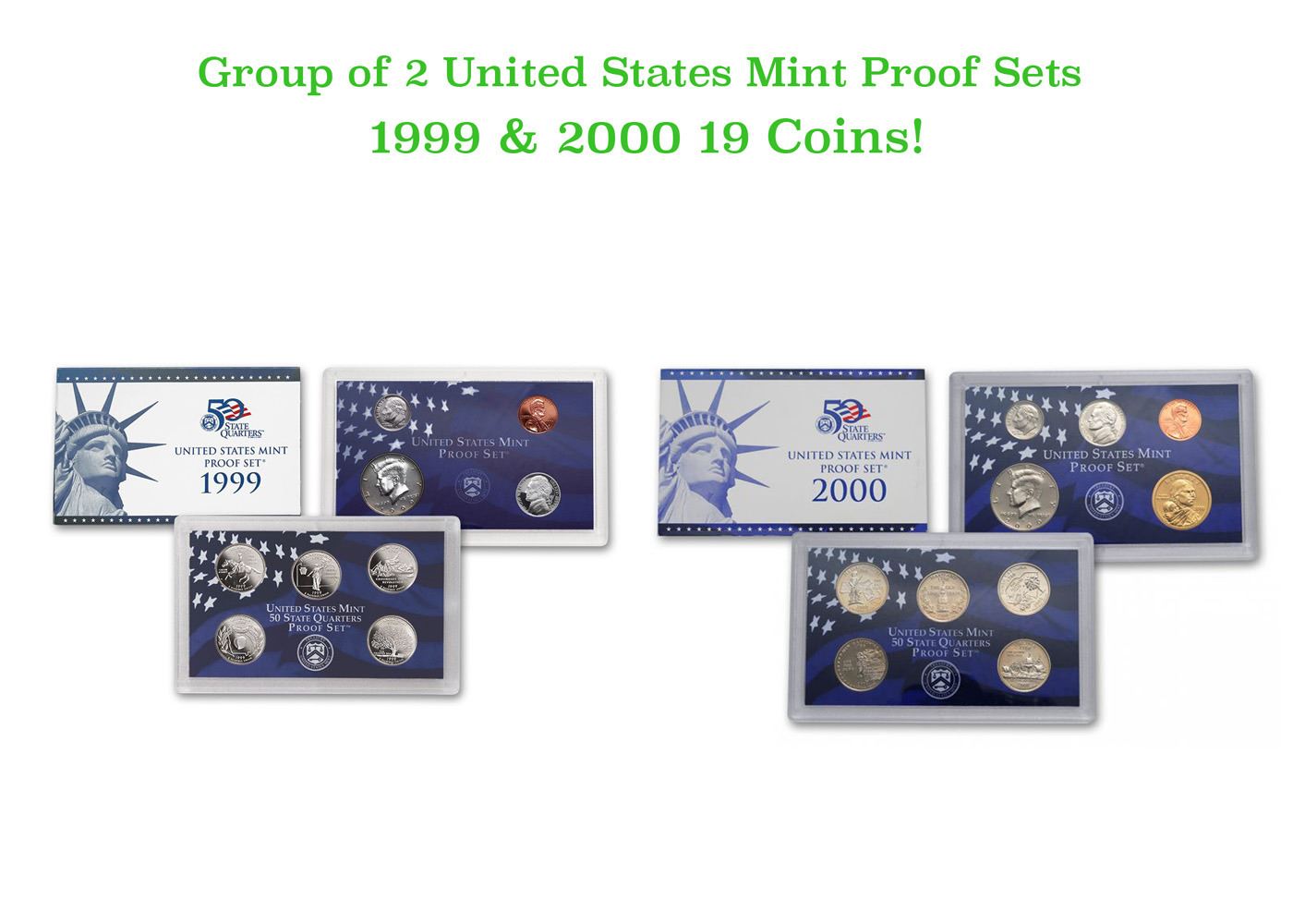 Group of 2 1999-2000 United States Quarters Proof Set - 10 pc set - Low Mintage. 1999-2000 United States Quarters Proof Set - 10 pc set Low mintage. Each Set contains 5 Proof State Quarters. They are Delaware, Georgia, Pennsylvania, Connecticut, New Jersey, Massachusetts, Maryland, South Carolina, New Hampshire, and Virginia. Total of 10 pieces; Complete with Original Packaging and COA.