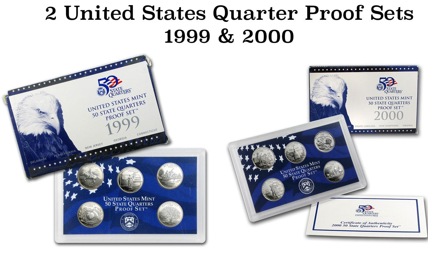 Group of 2 1999-2000 United States Quarters Proof Set - 10 pc set. 1999-2000 United States Quarters Proof Set - 10 pc set Low mintage. Each Set contains 5 Proof State Quarters. They are Delaware, Georgia, Pennsylvania, Connecticut, New Jersey, Massachusetts, Maryland, South Carolina, New Hampshire, and Virginia. Total of 10 pieces; Complete with Original Packaging and COA.